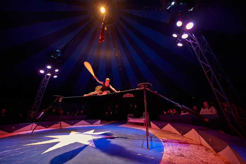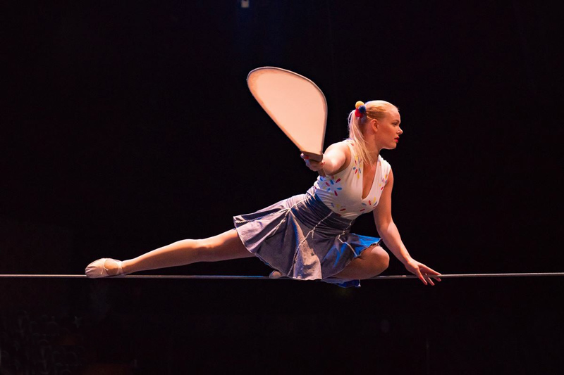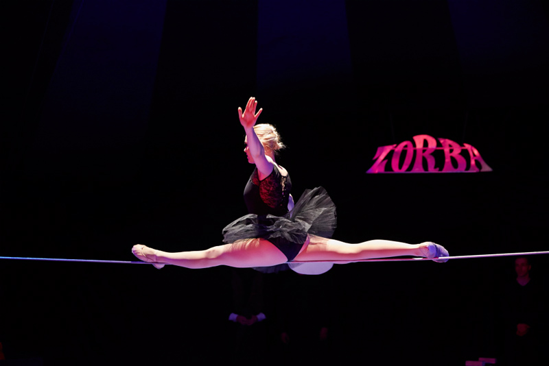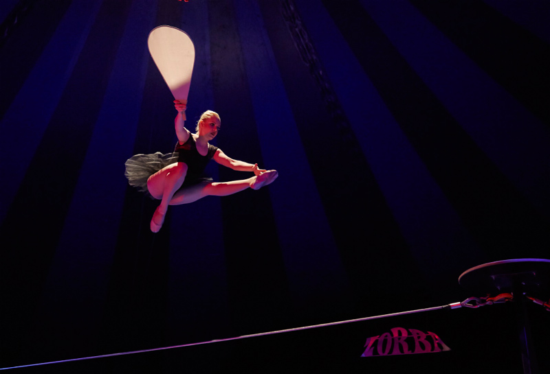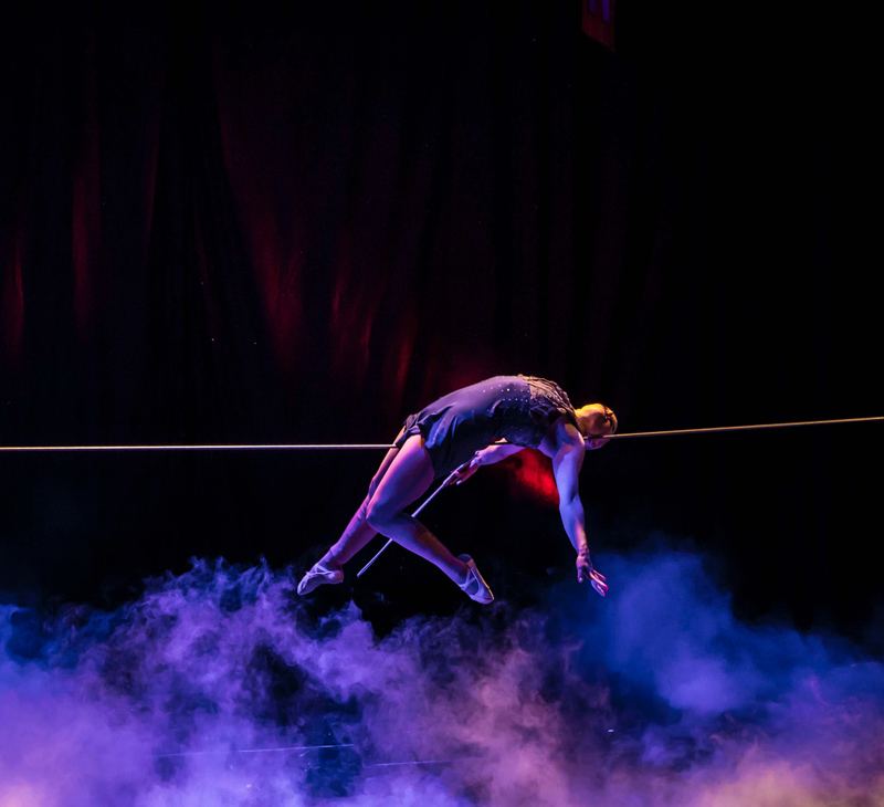 Mostrando una tecnica impeccabile ed eleganza squisita, la nostra specialista nel camminare sul filo lascia sempre gli spettatori stupefatti con la sua dimostrazione di equilibrio perfetto.