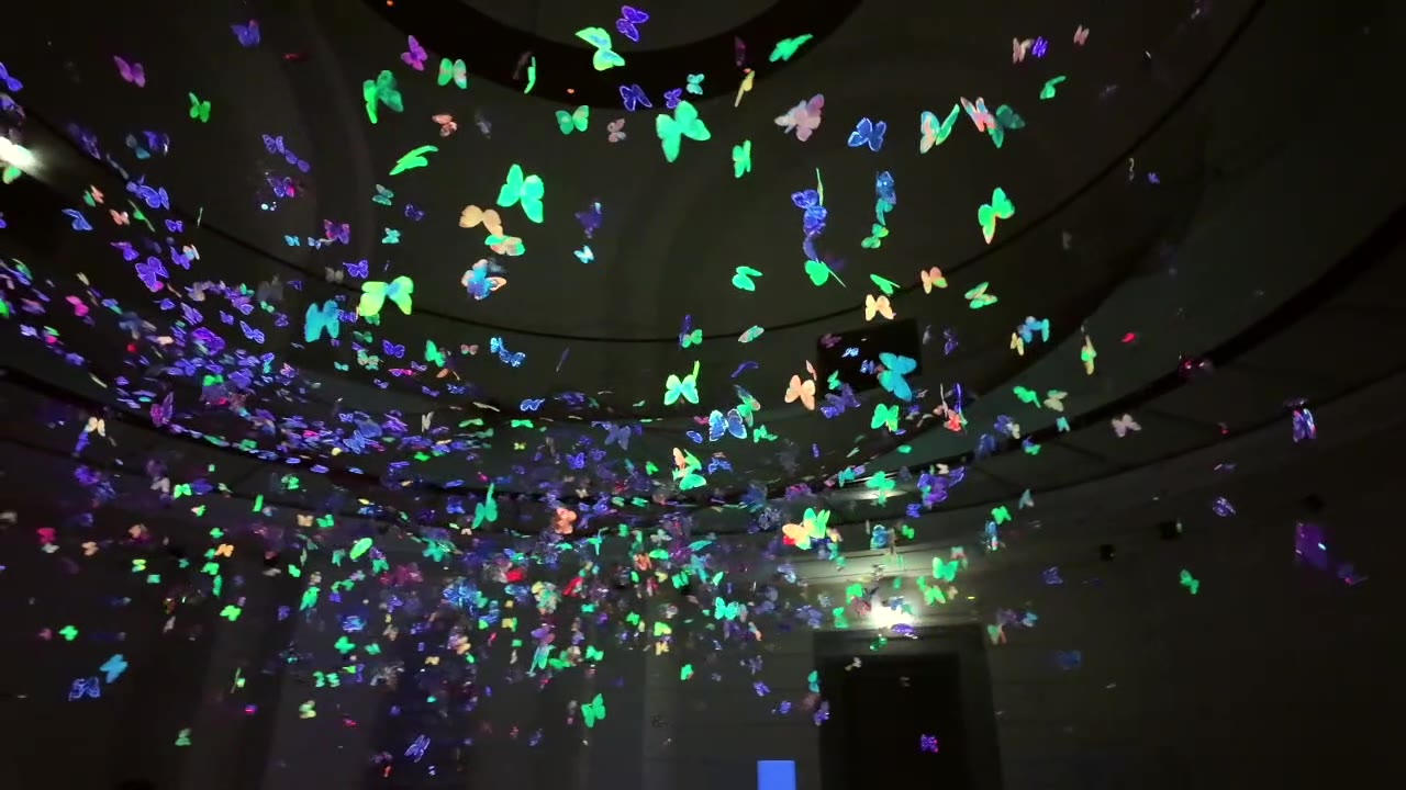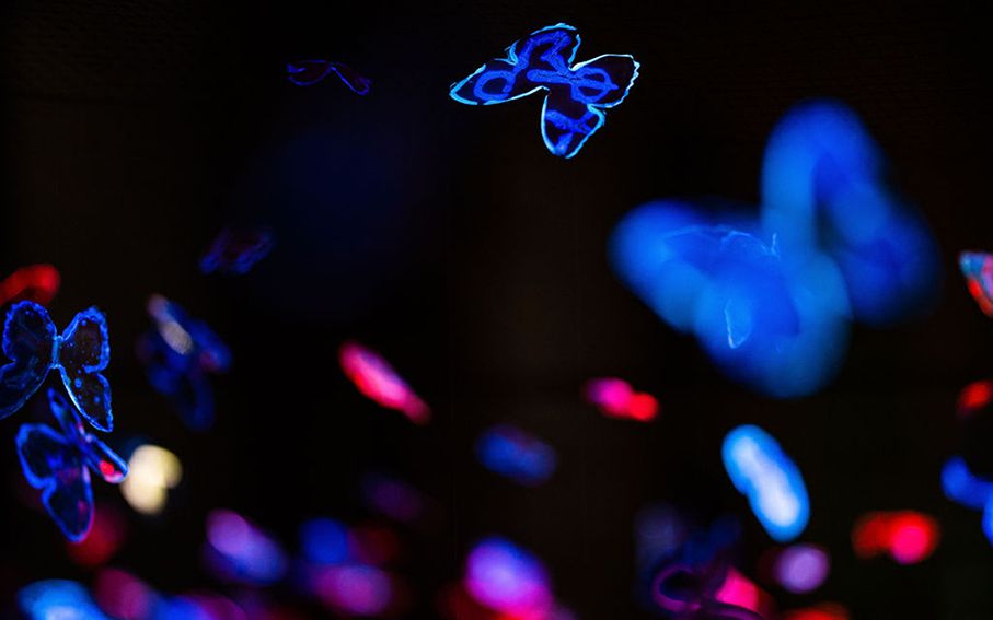 Una installazione personalizzata per ogni location con fino a 3.000 farfalle sospese, illuminazione UV, paesaggio sonoro e un sistema di installazione completo