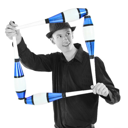 Chris può anche eseguire giocoleria con il fuoco, bastone del diavolo o giocoleria con i coltelli per aggiungere quel tocco spettacolare al tuo evento!