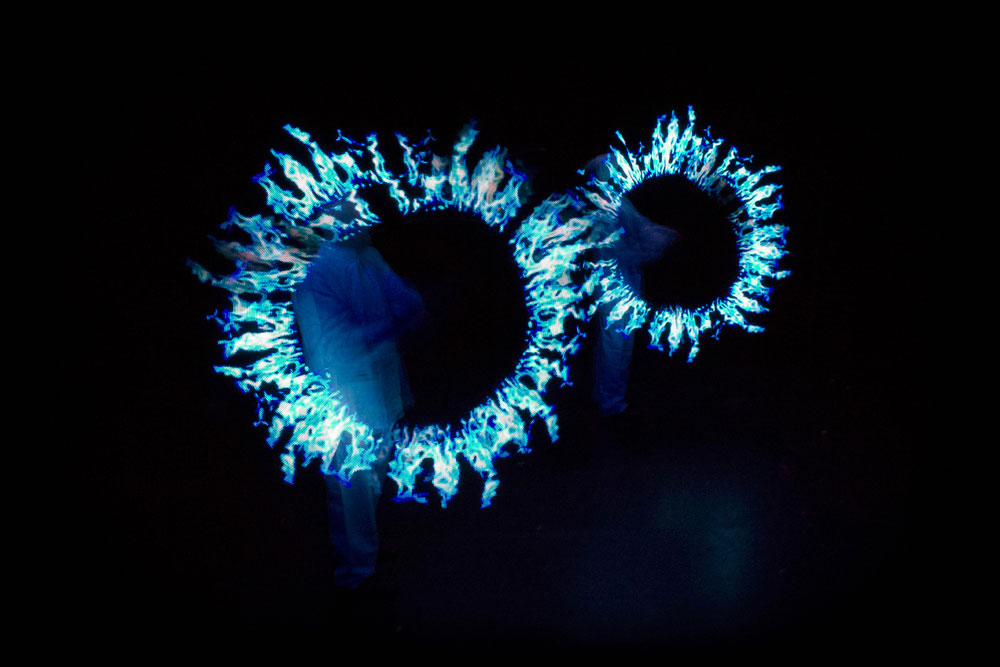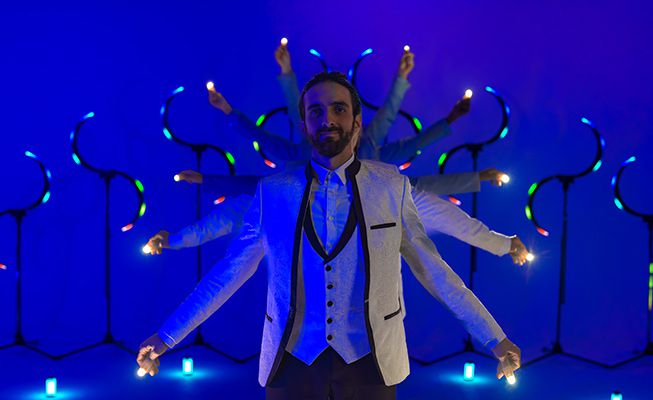 Aggiungono un elemento visivo extra alle loro performance indossando abiti bianchi semplici, che diventano una tela bianca, riflettendo sottilmente i colori dei loro strumenti illuminati. Velocissimi, questi giocolieri di classe mondiale creeranno un caleidoscopio di luce e colore, creando un impatto visivo straordinario che non sarà dimenticato.