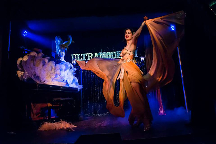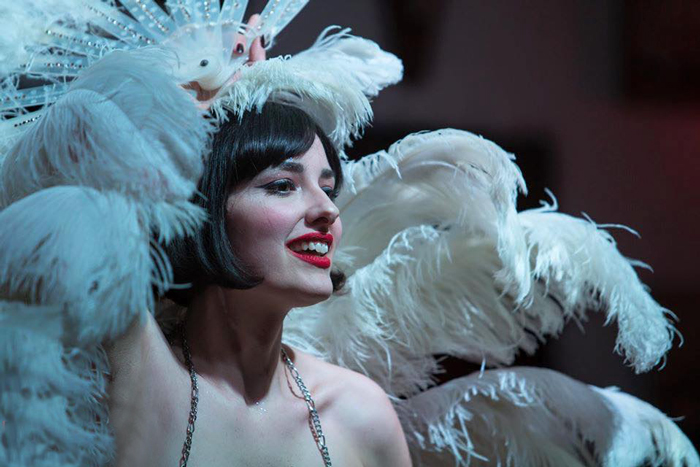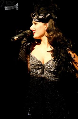Con la sua pelle di avorio e le labbra scarlatte, giocando con ironia e seduzione, tutti i suoi talenti vengono messi in evidenza durante una performance di Burlesque. I suoi spettacoli di neo-Burlesque proiettano lo spettatore in un viaggio onirico nel passato, dove preziosi costumi retrò, appositamente realizzati per ogni spettacolo, fungono da cornice per le sue incredibili performance.