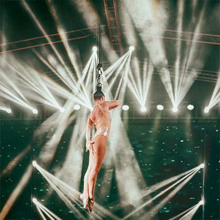 Eseguendo sospesa unicamente dai suoi capelli, questa straordinaria acrobata aerea offre uno spettacolo mozzafiato per eventi di lusso e intrattenimento dal vivo.