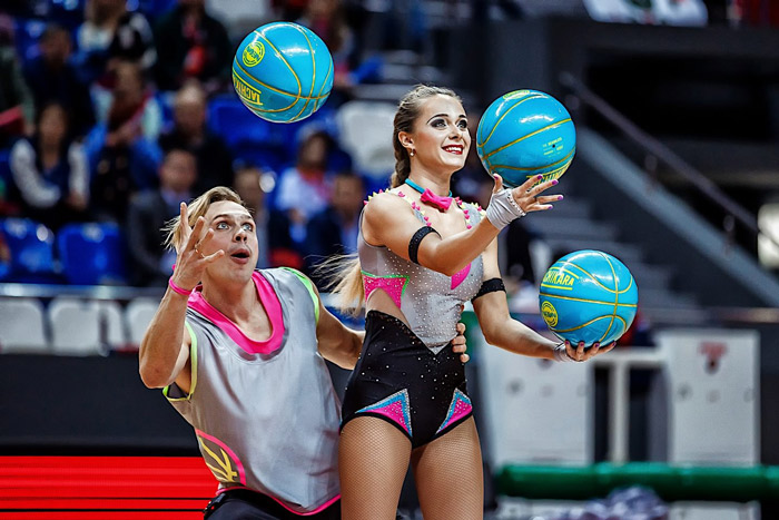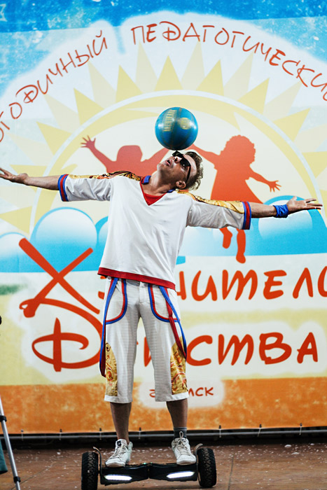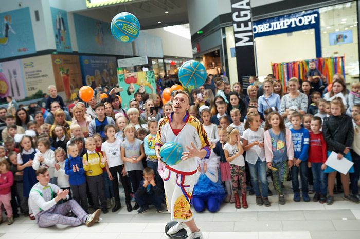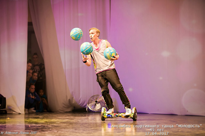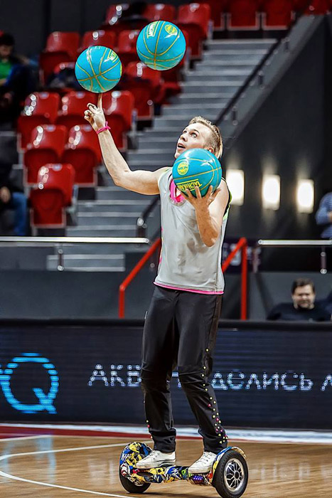 Lo spettacolo ad alta velocità presenta il nostro giocoliere professionista di pallacanestro che esegue trucchi mentre è su un hoverboard.