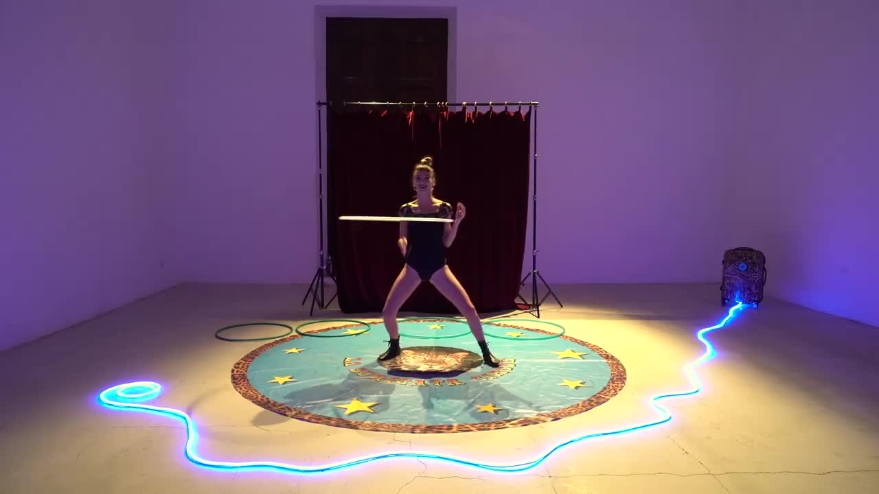 La nostra artista di Hula Hoop LED esegue coreografie divertenti e set ambientali utilizzando diversi cerchi colorati e cerchi infuocati.