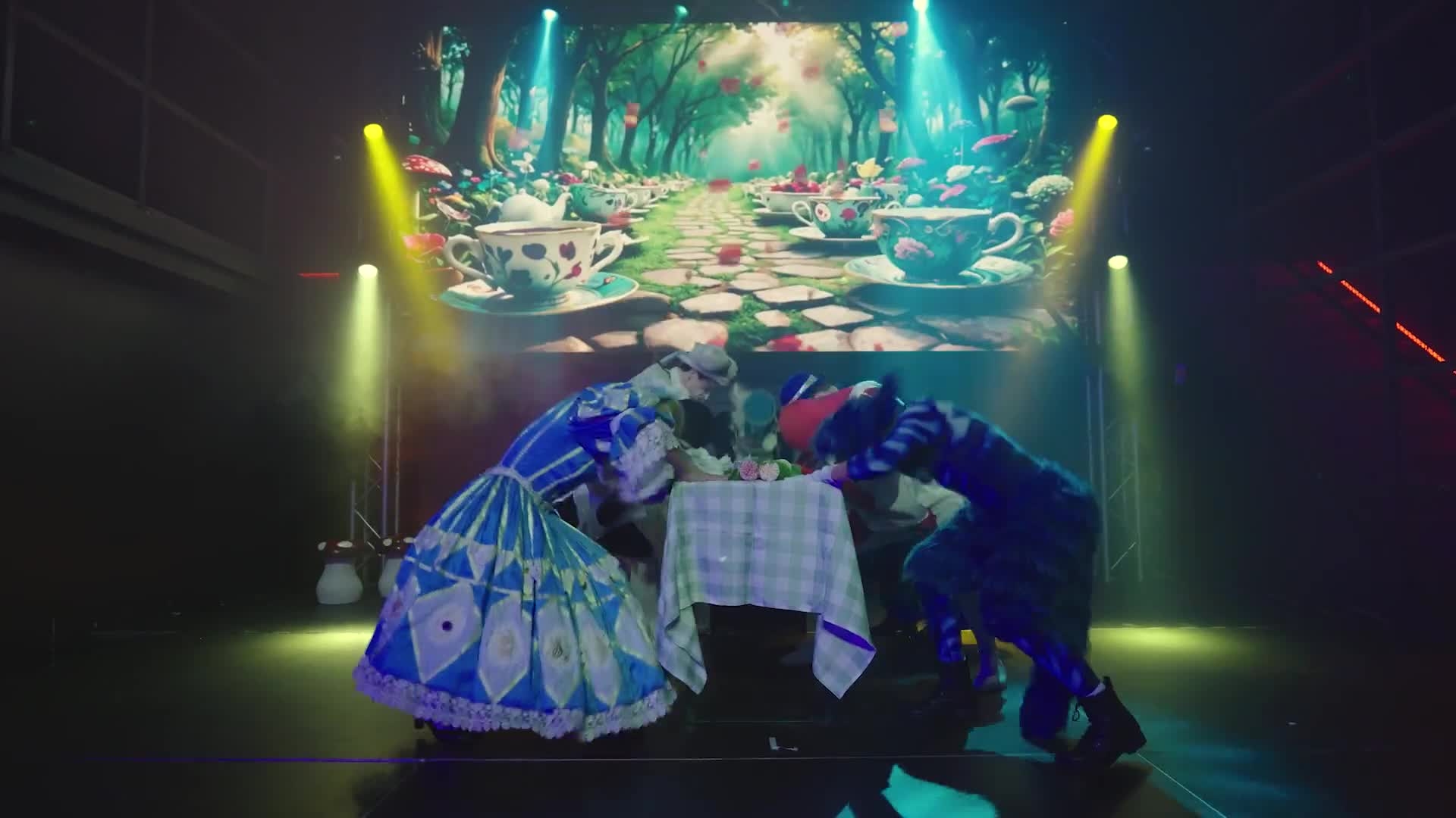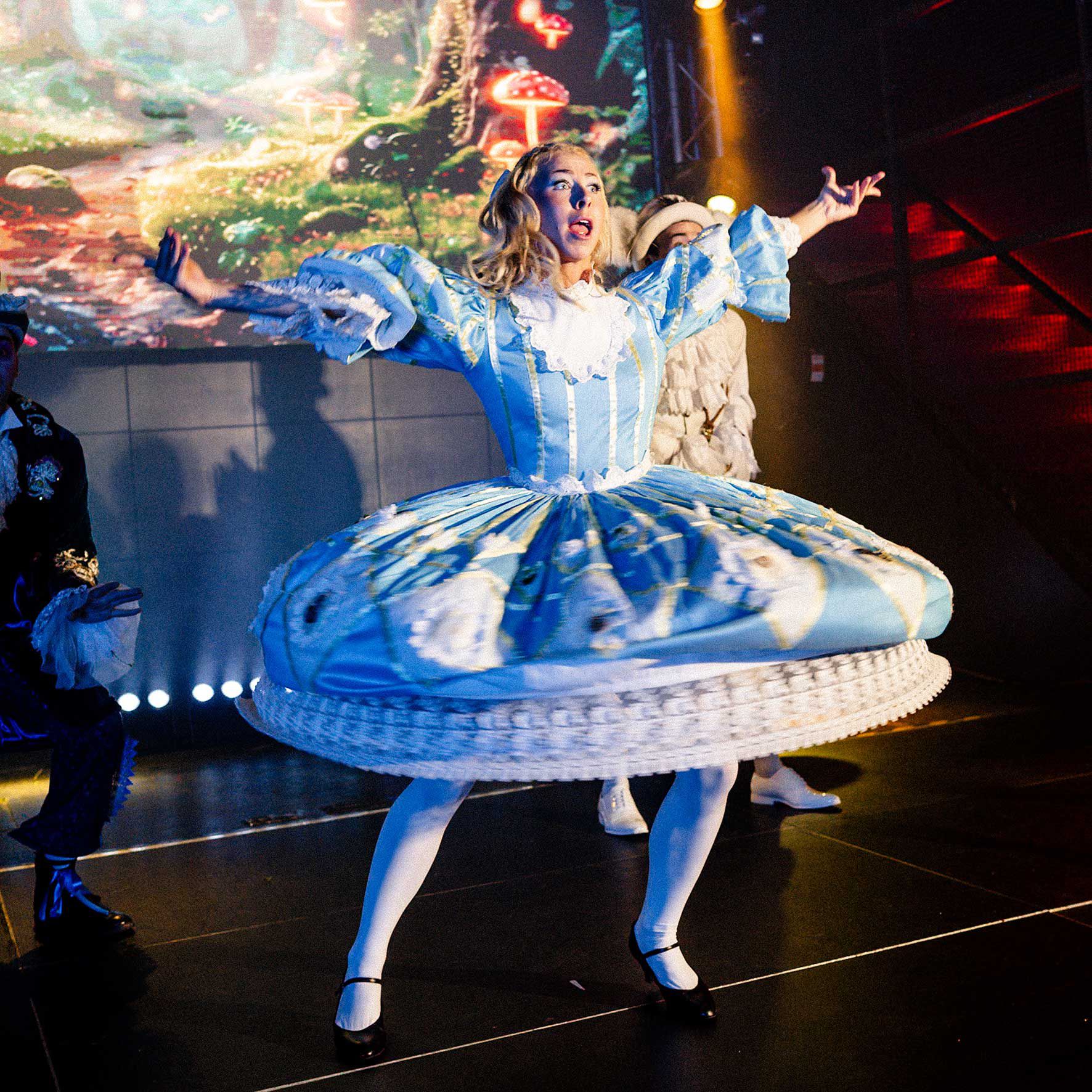 Al centro dello spettacolo c'è una sceneggiatura splendidamente realizzata, resa viva da coreografie di livello mondiale e da una colonna sonora di canzoni universalmente popolari che mantengono alti i livelli di energia e coinvolgono pienamente gli ospiti. I contenuti cinematografici di alta qualità utilizzati durante lo spettacolo creano transizioni di scena fluide e trascinano il pubblico più in profondità nell'avventura surreale di Alice, facendolo sentire parte della storia.
