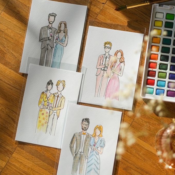 Ogni ospite partecipante riceve un ritratto personalizzato dipinto a mano su carta acquerello di alta qualità, splendidamente confezionato come regalo da portare a casa unico.