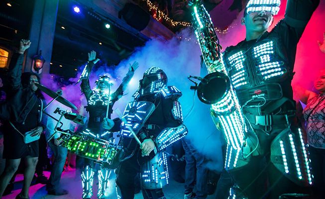 Risvegliando il pubblico a una nuova era dell'intrattenimento, questo batterista luminoso si aggira per gli eventi, interagendo con ogni ospite e membro del pubblico e improvvisando con altri spettacoli, DJ e musicisti. L'artista perfetto per qualsiasi nightclub, inaugurazione di un marchio, campagna pubblicitaria o qualsiasi evento che desideri un intrattenimento futuristico che porterà il loro evento al livello successivo.