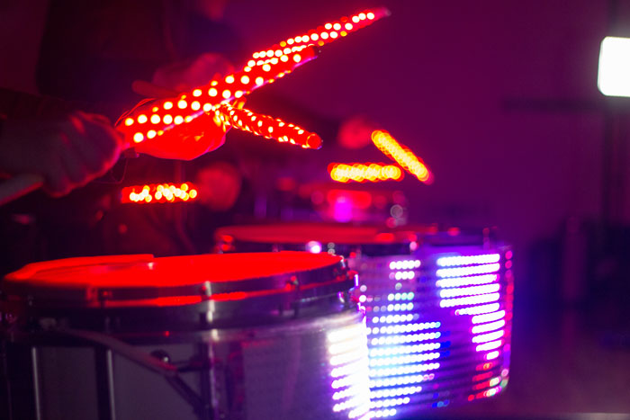LED Drums and Brass utilizza una straordinaria tecnologia LED all'avanguardia per creare uno spettacolo audio e visivo affascinante da guardare quanto da ascoltare. Dotati di bacchette luminose, pannelli e strisce LED, i musicisti LED hanno creato spettacoli luminosi complessi che sono sincronizzati sia tra gli strumenti e una traccia audio che tra loro. Coreografano routine di alto livello con una batteria rudimentale altamente visuale e trucchi con le bacchette. I loro spettacoli luminosi unici sono completamente personalizzabili e possono mostrare testi o loghi sui tamburi e includere loghi stampati sui grancasse illuminati.