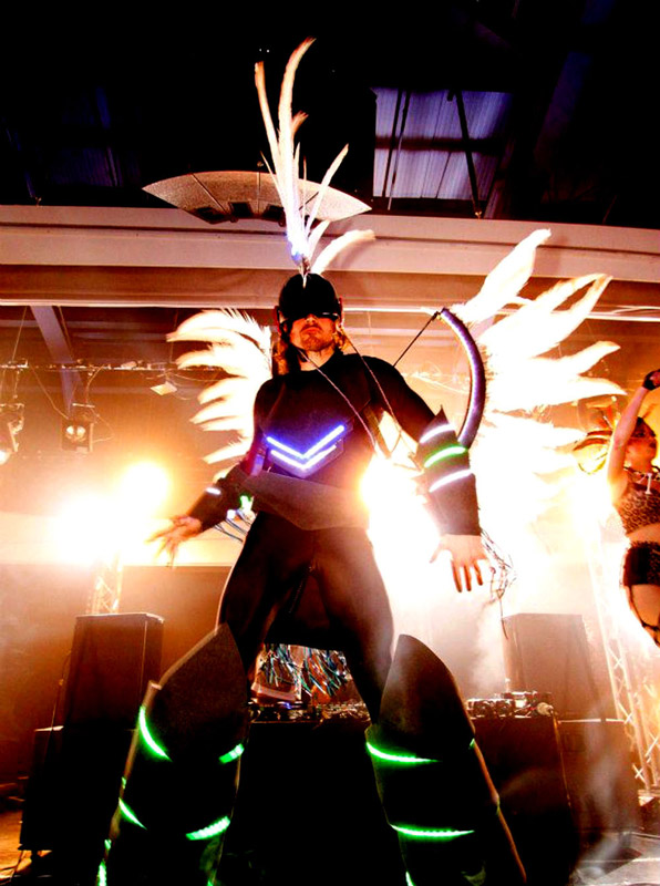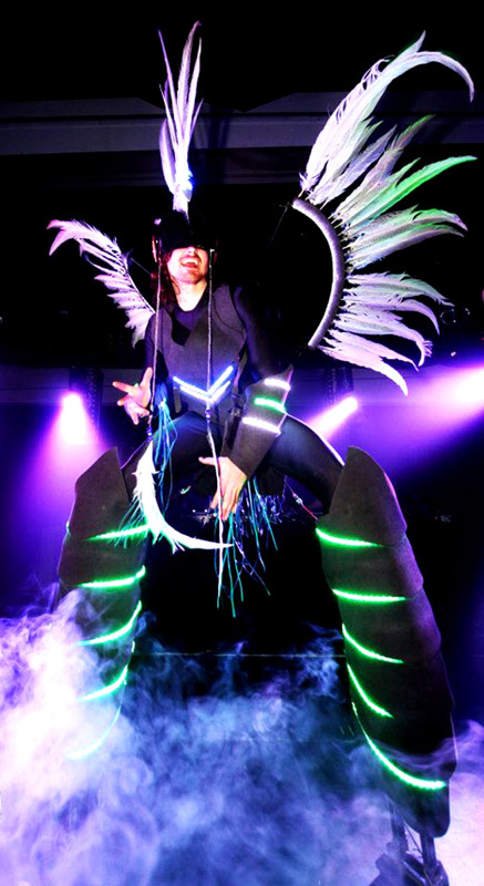 La nostra bellissima esposizione di luce, alta quasi 10 piedi, presenta vere piume e un mozzafiato cresta che emana lame di luce. Gli ospiti adoreranno interagire con il nostro artista sui trampoli, che è dotato di autentiche piume di fagiano che renderanno il ballo con il nostro imponente gigante un'esperienza indimenticabile. Opportunità fotografiche uniche aiuteranno anche gli ospiti a immortalare la loro esperienza con il nostro spettacolo LED Mohawk, offrendo un fattore "cool" istantaneo durante tutto l'evento. Questa meravigliosa costruzione di luce e suono sorprenderà gli ospiti con un ultimo trucco, un sistema pirotecnico collegato alle sue mani per accendere la tua festa al massimo.