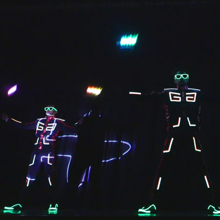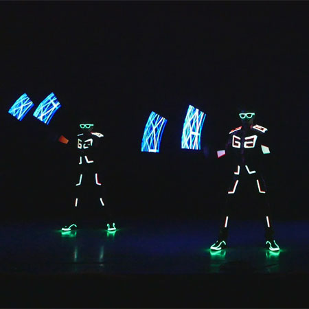 I nostri performer di pixel poi non solo possono offrire spettacoli ipnotici da solisti, ma possono anche incorporare una serie di altre abilità ad alta tecnologia in ogni atto, tra cui manipolazione laser, danza UV e combattimento tron.