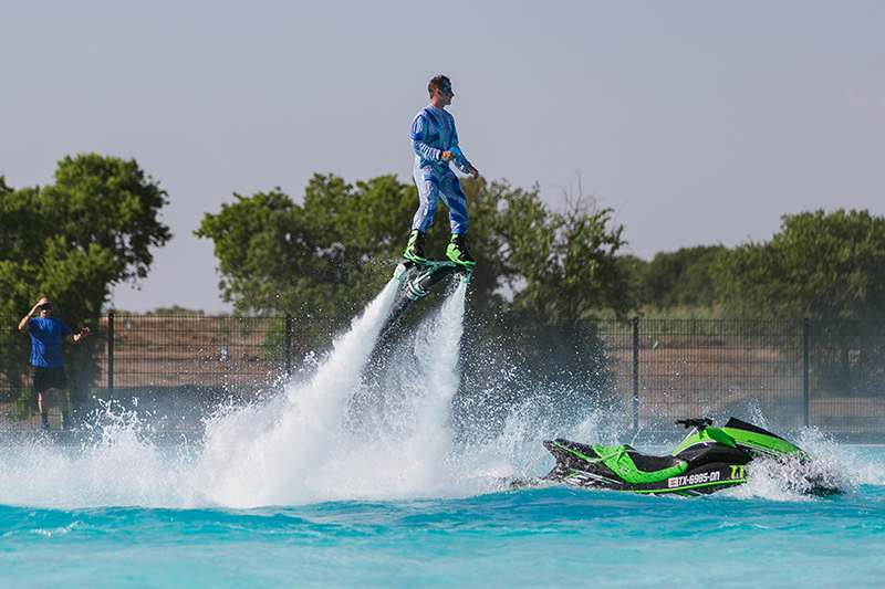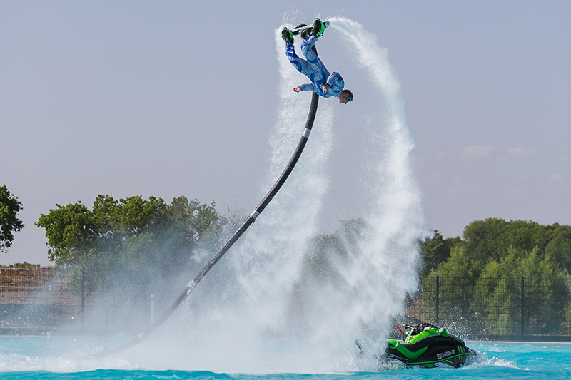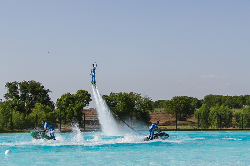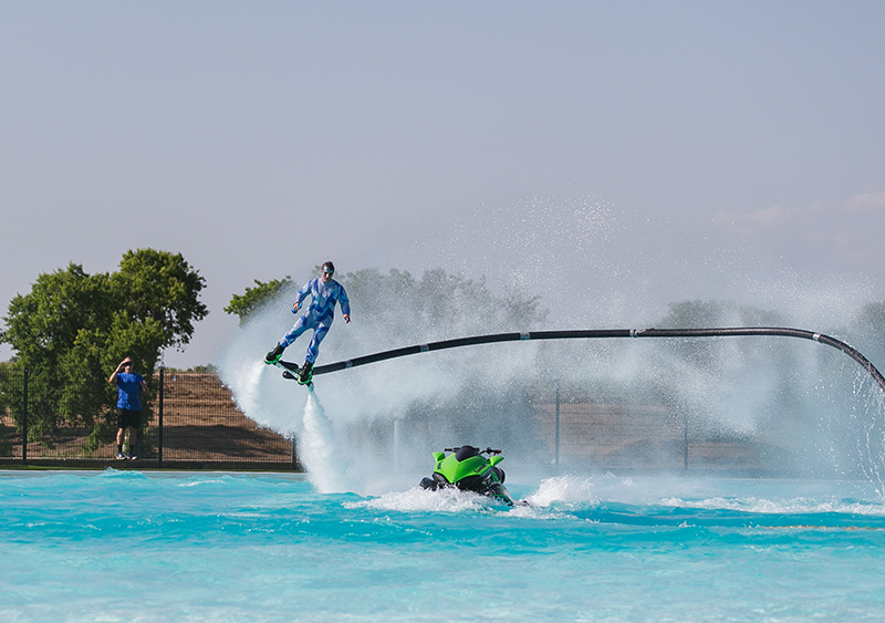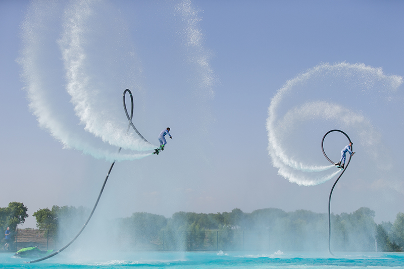 Gli ospiti si volteranno per tenere d'occhio i nostri flyboarders mentre volteggiano all'unisono nell'aria, spingendosi verso altezze vertiginose.