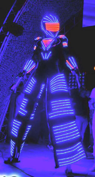 Un performer esperto, il nostro robot LED offre un intrattenimento emozionante e futuristico che sicuramente impressionerà, con la sua tuta visivamente spettacolare che contiene oltre 3500 luci LED multicolore in totale. Veramente unico, questo robot sui trampoli arriva completo di 4 fasci laser verdi, 2 fasci laser blu, cannoni CO2, un cannone di coriandoli e fontane di scintille, offrendo una performance sensazionale mentre balla a ritmo di musica, cambia colore e spara coriandoli e nebbia nella folla.
