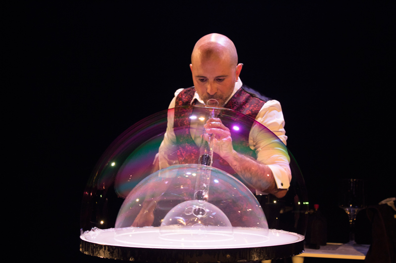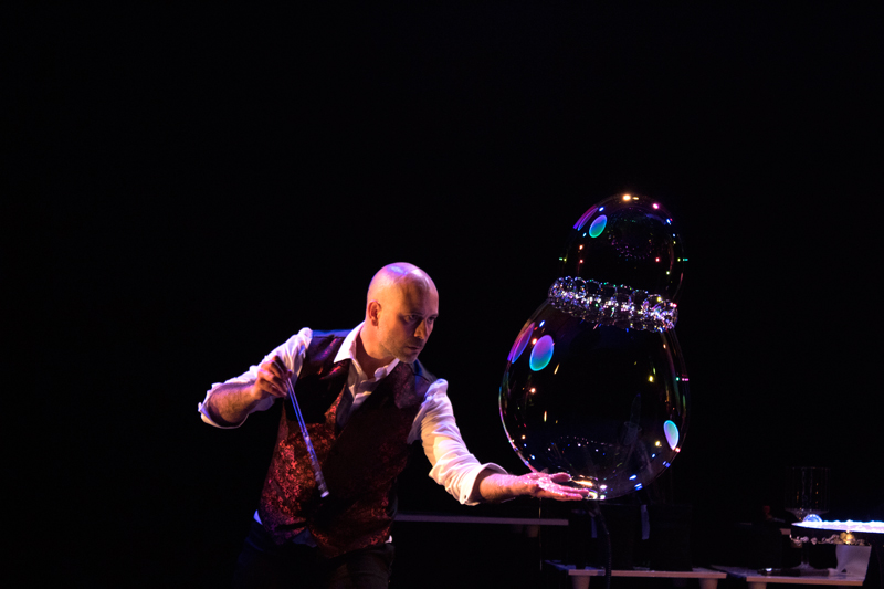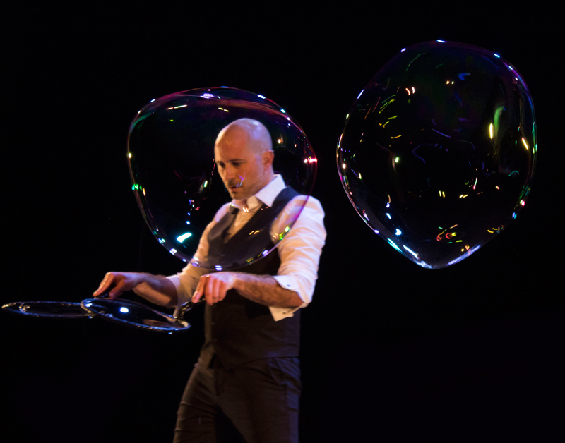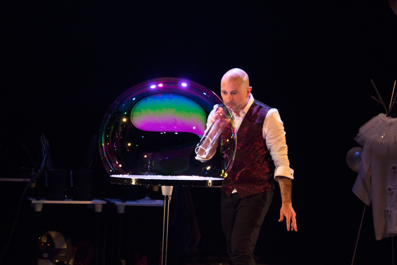 Amato sia dai più piccoli che dagli adulti, questo spettacolo unico coinvolge la partecipazione del pubblico poiché il performer può mettere le persone all'interno di bolle giganti!