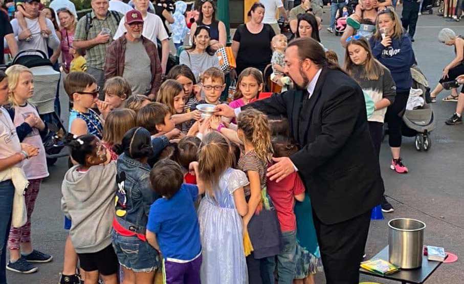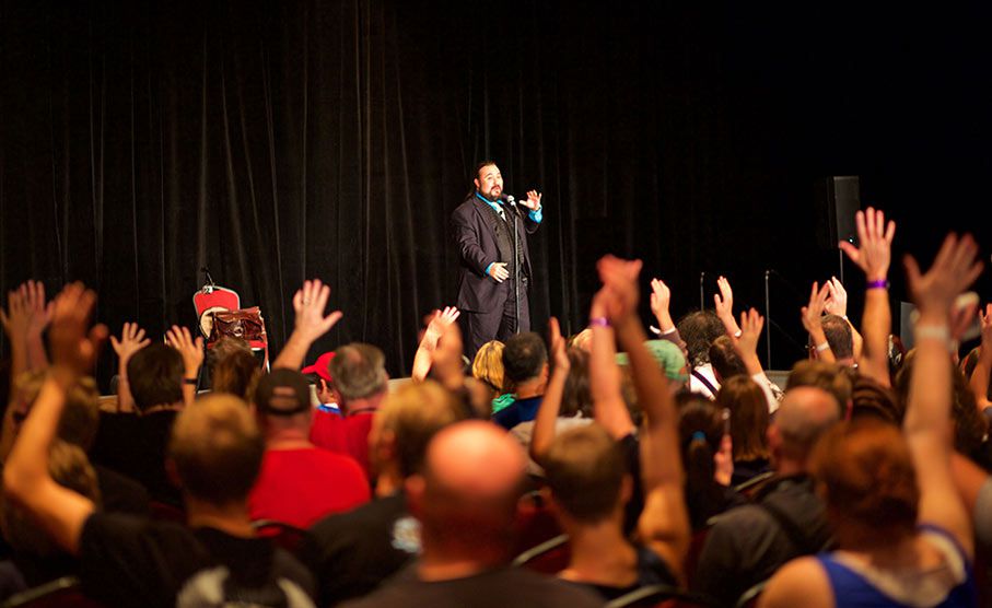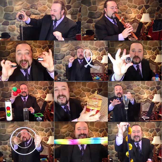 I suoi spettacoli interattivi e personalizzati possono essere eseguiti sul palco o online per gruppi aziendali, pubblico universitario, club e famiglie.