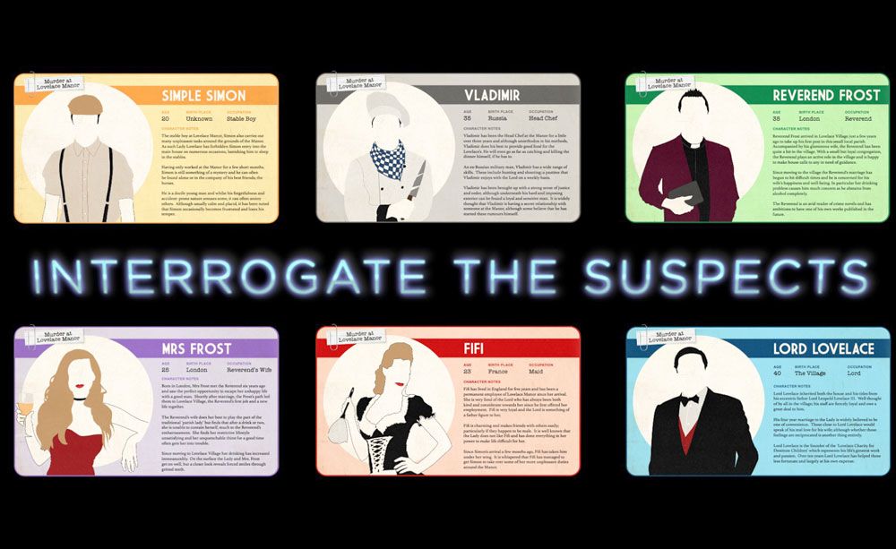 Assassinio al Maniero: I vostri ospiti vengono invitati a una serata di beneficenza tenutasi presso la casa di Lord e Lady Lovelace. Facendo parte di un evento di beneficenza, l'eccentrico Signore ha deciso di organizzare una cena. Con ospiti colorati, tra cui il reverendo locale, così alla moda, e sua moglie, un po' inappropriata, sarete serviti da uno chef russo, una civettuola cameriera francese e un ragazzo di stalla relativamente semplice. Dopo un orribile omicidio, la serata volge al peggio. Attraverso la deduzione dei vostri ospiti e la scoperta delle prove, verranno a galla sporchi segreti e sordide bugie. È solo con l'astuzia dei vostri ospiti che questo subdolo omicidio può essere risolto.