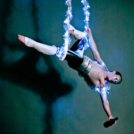 Avendo bisogno di un minimo di attrezzatura per esibirsi, puoi persino prenotare il nostro acrobata aereo con champagne festivo per esibirsi in locali bassi e tende.