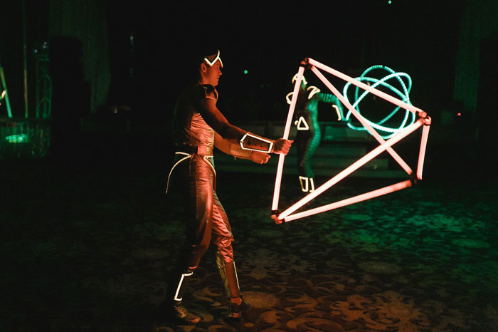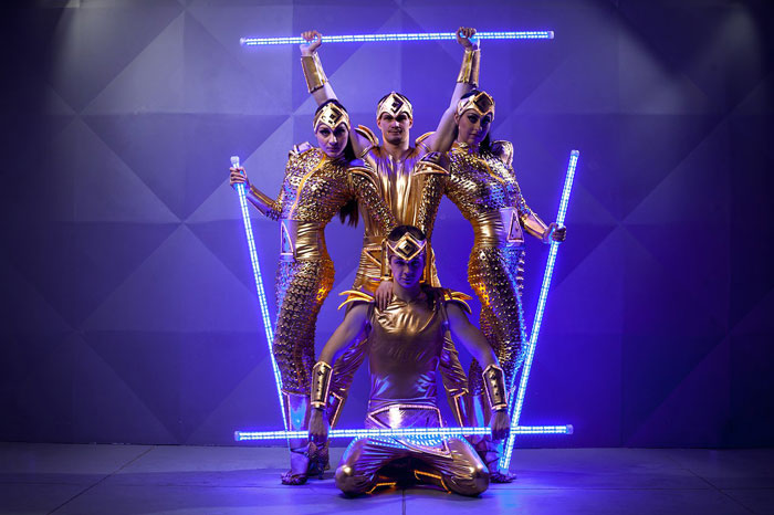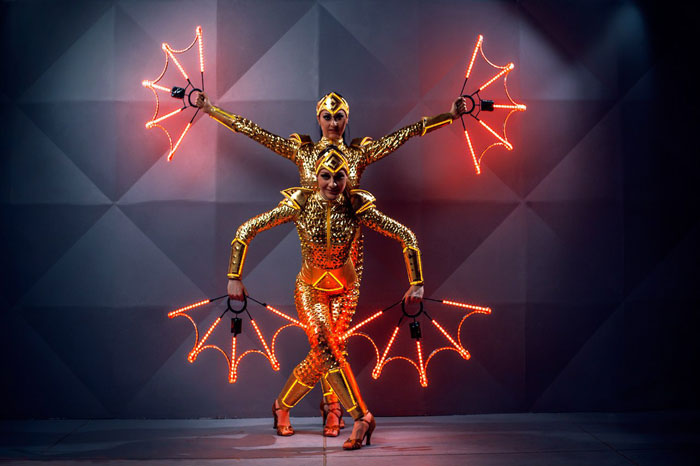 Questo spettacolo a tema gold mozzafiato è perfetto per eventi di alto livello in cui l'intrattenimento di lusso è fondamentale per il successo. I clienti possono scegliere da uno a otto performer circensi LED e lo spettacolo LED sarà personalizzato di conseguenza. I costumi dorati su misura con luci incorporate sono incredibilmente eleganti e le coreografie sofisticate sono un piacere da guardare.