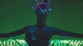 Questa suggestiva performance itinerante sui trampoli utilizza luci LED pulsanti in una gamma di colori, per creare una coda di pavone che sembra brillare mentre si muove