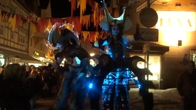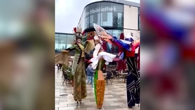 Innovativi camminatori su trampoli costumati che possono illuminare