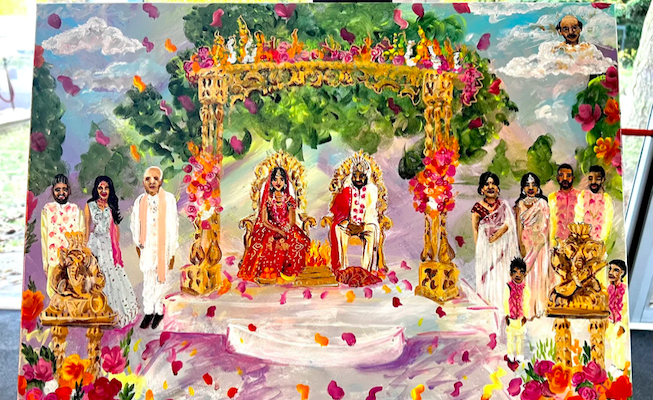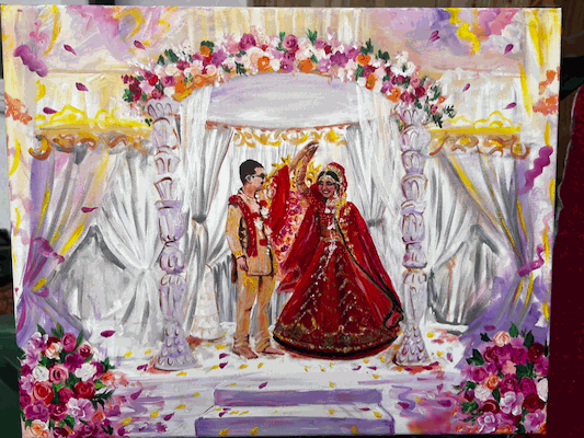 In grado di creare rappresentazioni dei tuoi spazi o momenti preferiti, il nostro pittore per eventi dal vivo catturerà diverse scene del tuo evento o matrimonio su un unico tela. Inoltre, può incorporare qualsiasi logo o marchio nei suoi capolavori.