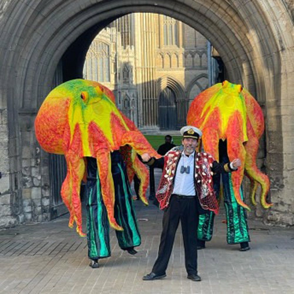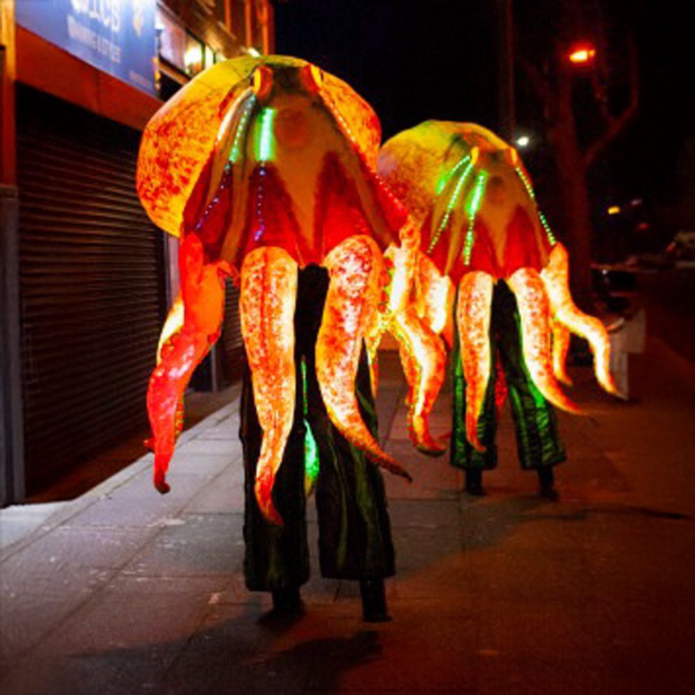 Artisti sui trampoli in costume a forma di polpo creano un impatto visivo indimenticabile, perfetti per attirare l'attenzione durante parate e festival.