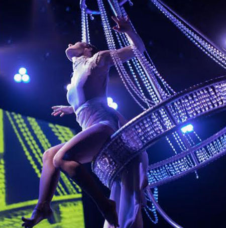 Immersa in strass e diamanti, questa eccezionale acrobata aerea del Quebec, il Chandelier Aerialist, incanta dall'alto con spettacoli impeccabili e costumi perfetti. Portando sofisticazione e glamour ad ogni evento, questa straordinaria performer aerea offre intrattenimento che porta il pubblico a nuove vette.