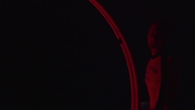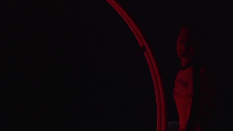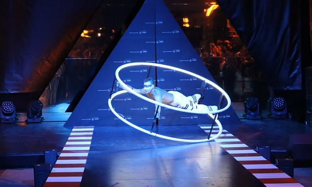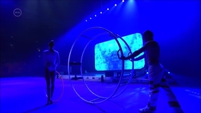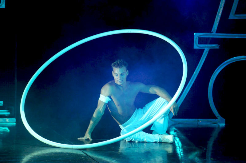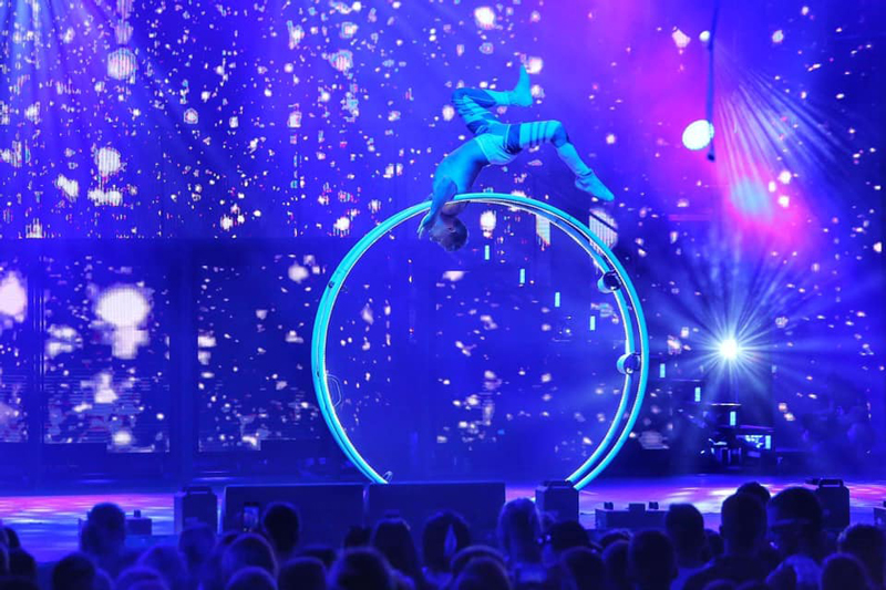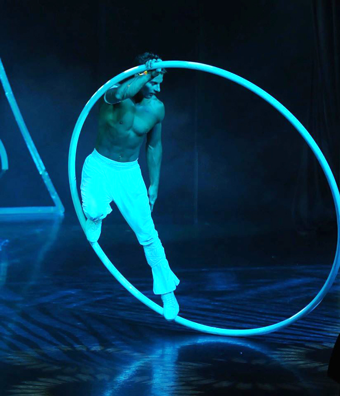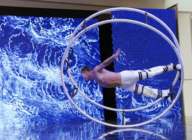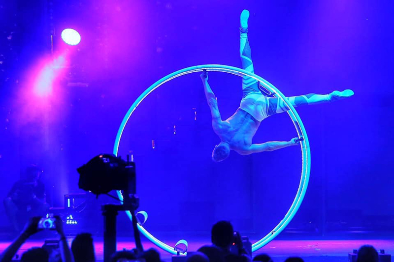 Artista circense estremamente abile e versatile esegue impressionanti esibizioni con la ruota tedesca e la ruota cyr