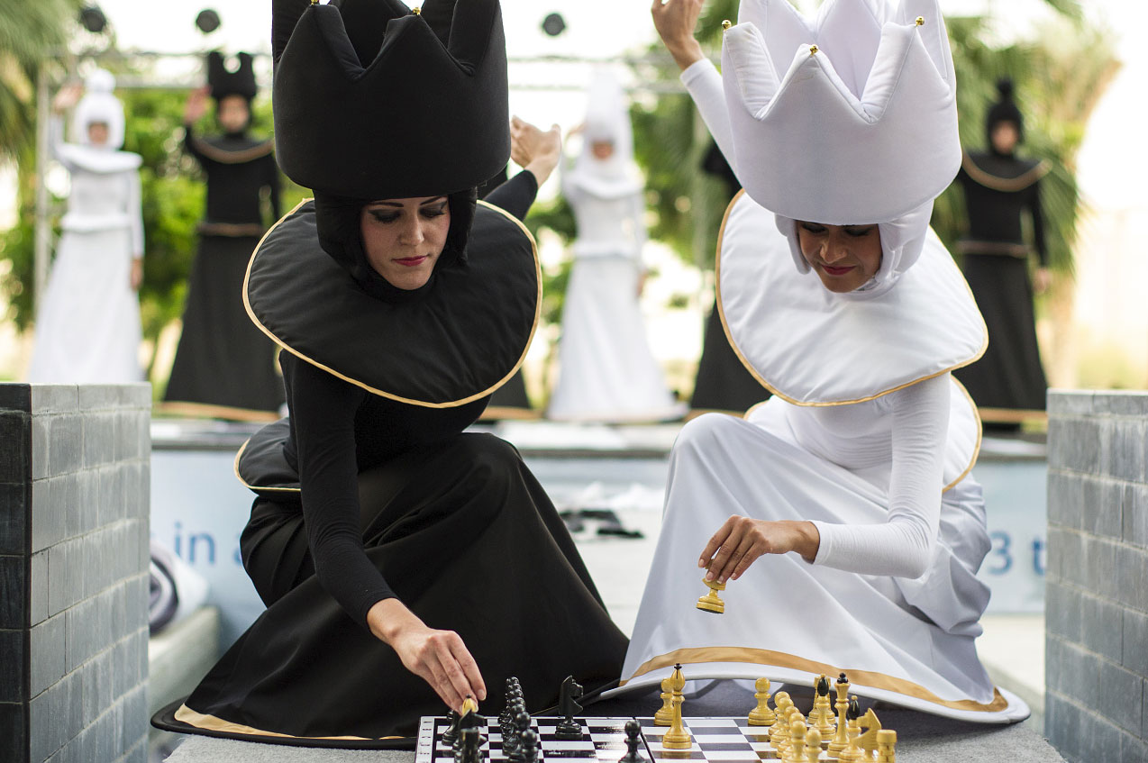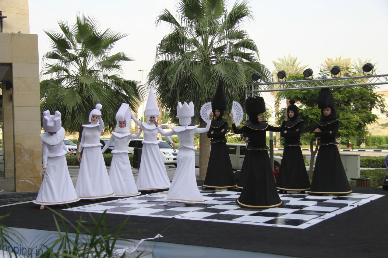 Vestito con costumi semplici ma efficaci, questo spettacolo di danza è una smart combination di teatro, divertimento e arte della danza. Costumi a scacchi bianchi e neri di alta qualità combinati con l'arte della danza coreografata sono i veri magneti per tutti gli amanti degli scacchi e i fan. Un'aggiunta molto elegante a qualsiasi evento.