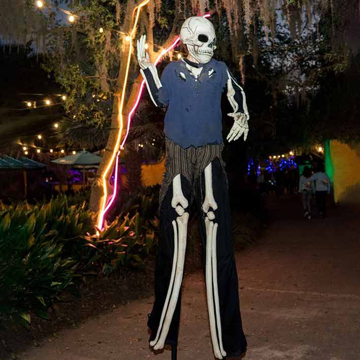 Con la sua imponente altezza, il nostro scheletro dalle lunghe gambe interagirà con gli ospiti, gli darà il cinque, si farà fotografare in posa e mostrerà anche alcuni spaventosi passi di danza.