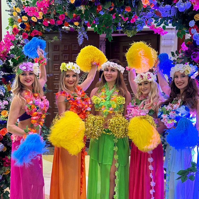 Prenota spettacoli completi, set in movimento o incontri; questi ballerini a tema accolgono gli ospiti con fiori, si mettono in posa per le foto e creano un'atmosfera tropicale.