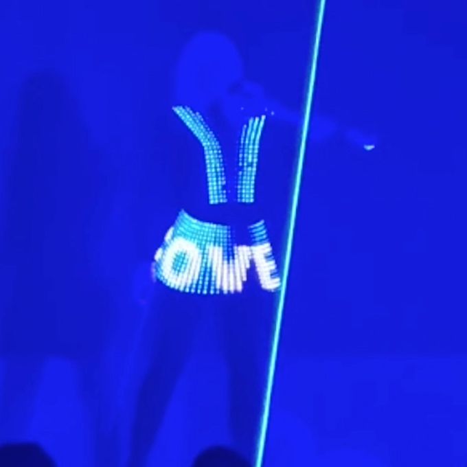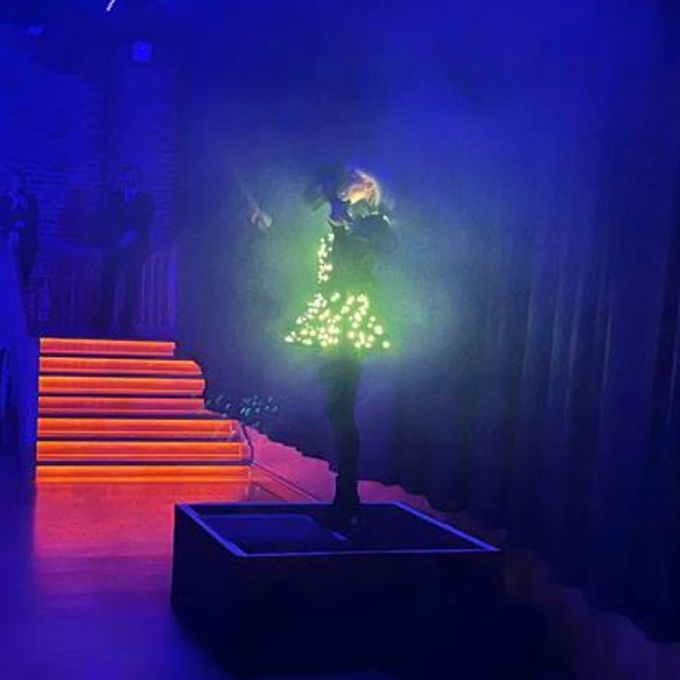 Eleva il tuo evento con un artista in un abito LED personalizzabile con colori, motivi e testi completamente personalizzabili.