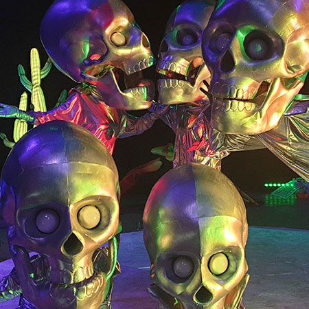 Fino a cinque birichini pupazzi a forma di teschio interagiscono in modo dispettoso con l'ambiente e il pubblico con opzioni di movimento libero e coreografato