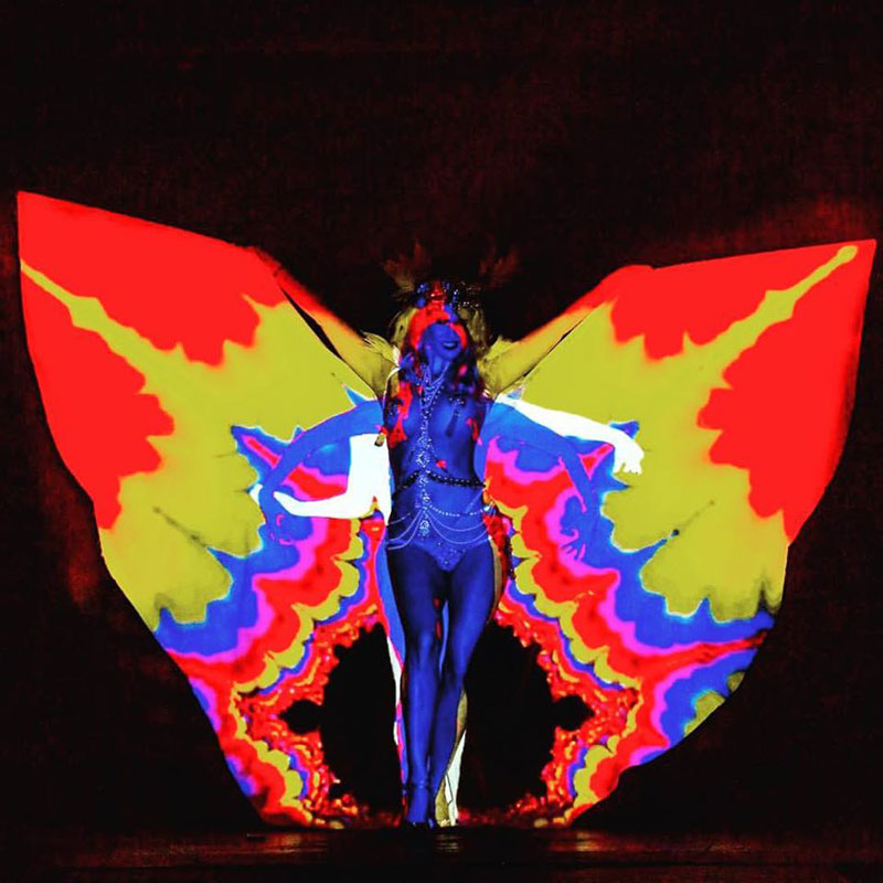 Eseguito da una sassy ballerina di burlesque alata, questo atto di danza con la tecnologia è garantito per portare il tuo evento a un livello completamente nuovo. Indossando un costume con ali giganti, la nostra artista eseguirà una coreografia sensuale migliorata da grafiche video mozzafiato proiettate sulle ali della ballerina.