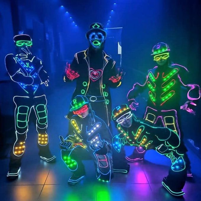 Il team di ballerini esperti coreografa mosse visivamente accattivanti che mettono in risalto i costumi a LED.