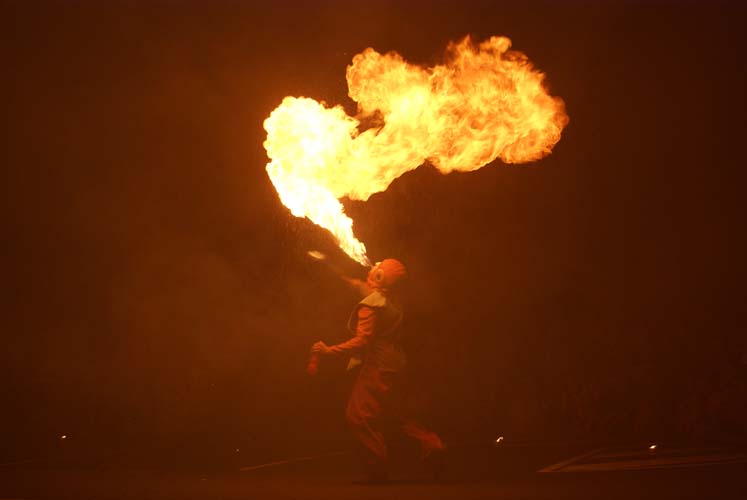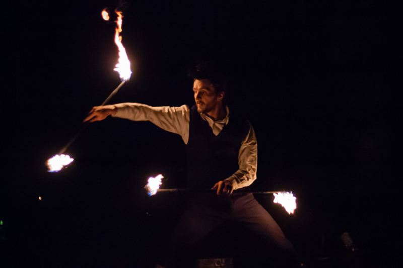 Con durate che vanno dai 15 ai 45 minuti, questo numero di giocoleria con il fuoco intreccia giocoleria coreografata, manipolazione di oggetti e piccole pirotecniche accese. Questi artisti versatili possono adattare il loro spettacolo per soddisfare le specifiche esigenze di ogni evento, in modo da potersi adattare a diverse situazioni, temi delle feste e alle esigenze degli organizzatori dell'evento.