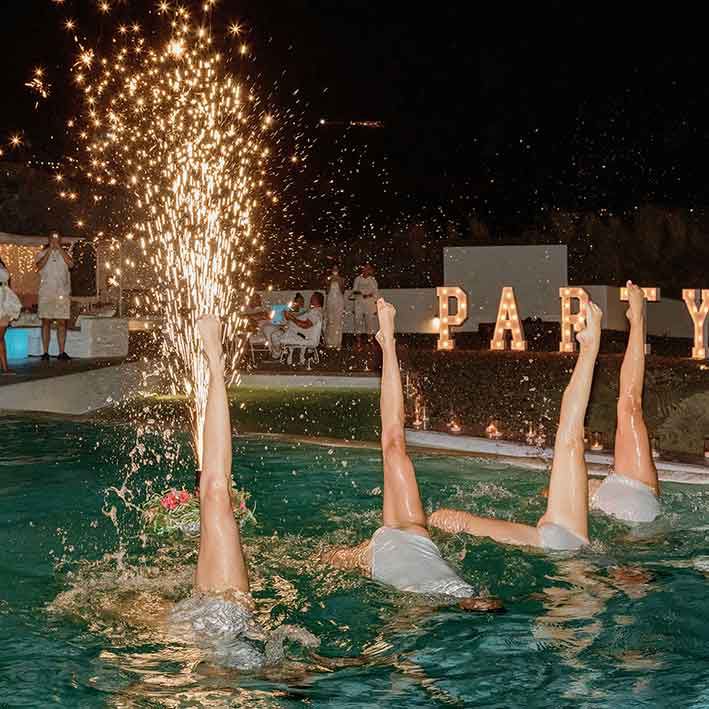 Perfetto per feste in piscina e eventi a luce bassa, i nostri nuotatori coreografati sono accompagnati da fuochi d'artificio scintillanti per aggiungere un tocco di eccitazione.