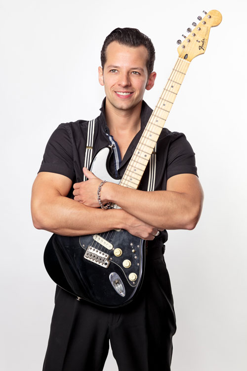 Il nostro cantante suona anche la chitarra durante le sue esibizioni per dare un tocco di rock 'n' roll.