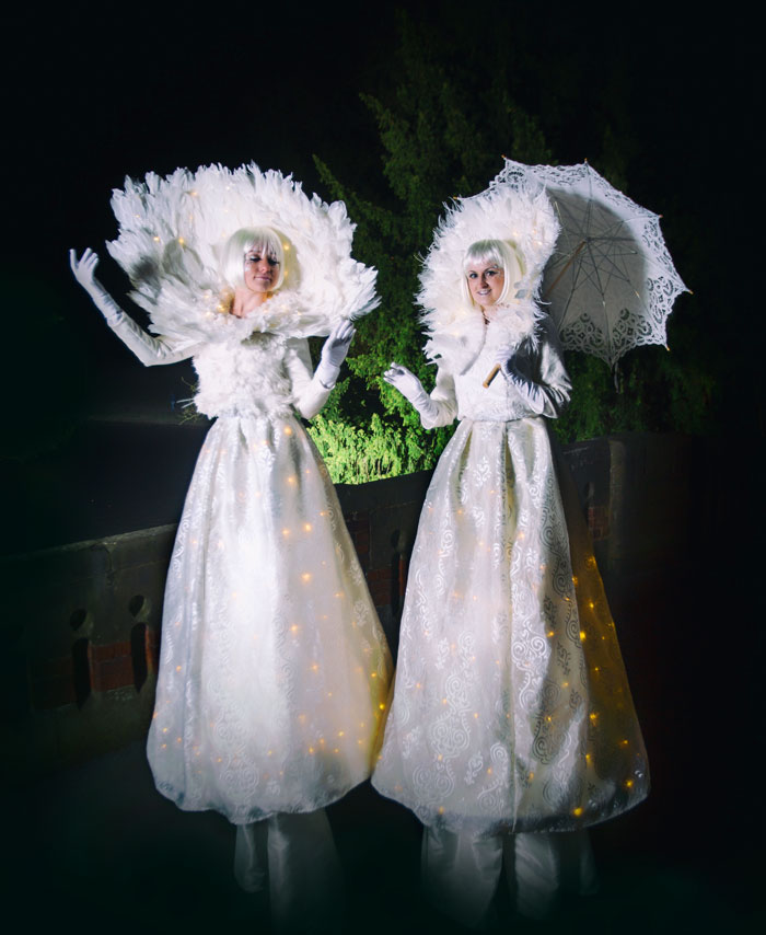 I nostri bellissimi Stilt Walkers invernali bianchi sono personaggi incantevoli ed eleganti che aggiungeranno un tocco di magia e bellezza al tuo evento. Gli stupefacenti stilt walkers bianchi sono un'attrazione itinerante che si fa strada elegantemente attraverso il tuo evento con i loro abiti eterei bianchi come la neve. I loro elaborati e magnificamente realizzati abiti sono adornati con lussuose piume bianche, gonne di raso bianco e chiffon che danzano delicatamente nella brezza con la morbida luce degli LED ambrati che catturano lo splendore dei gioielli e delle perle che sono annidati nei dettagli dei costumi.