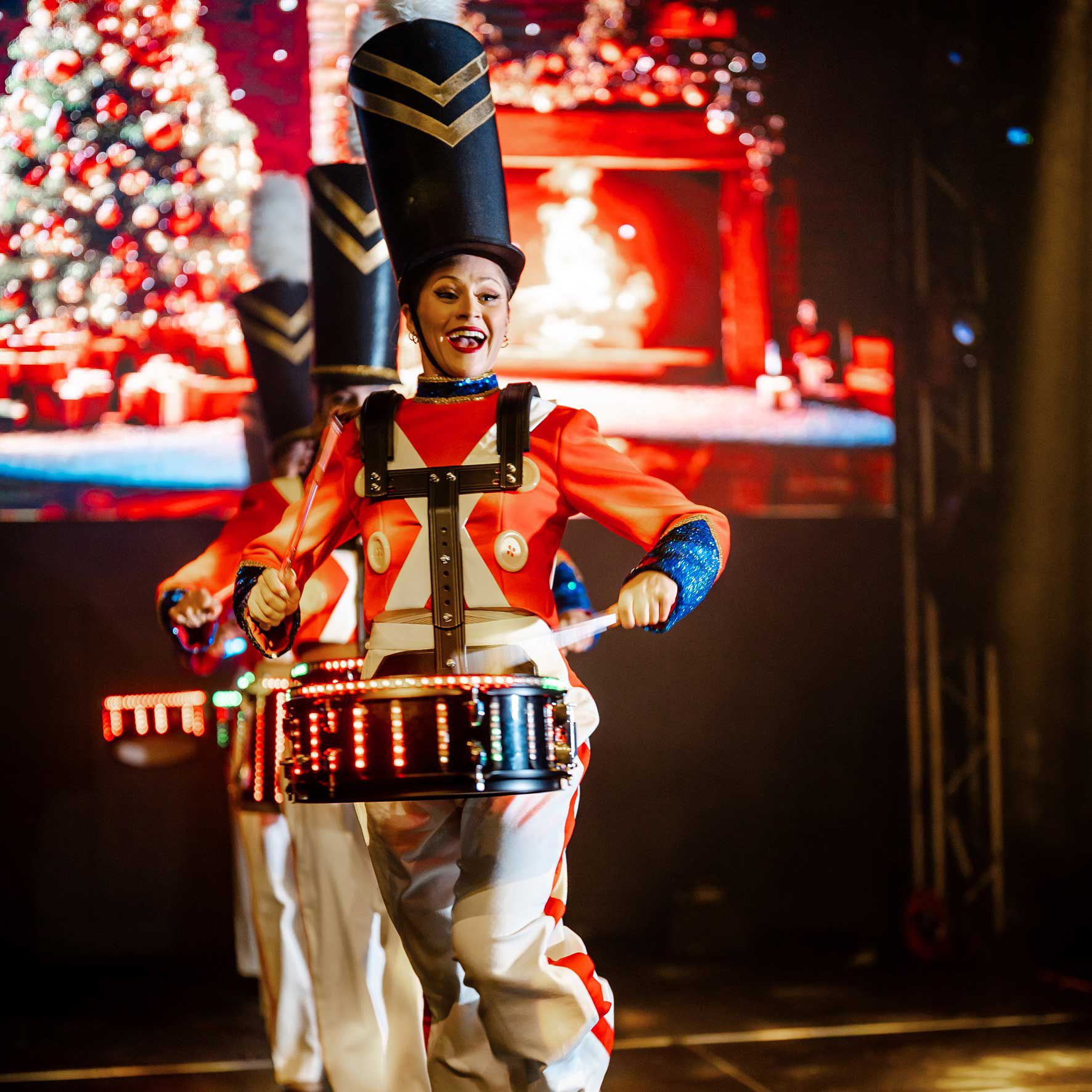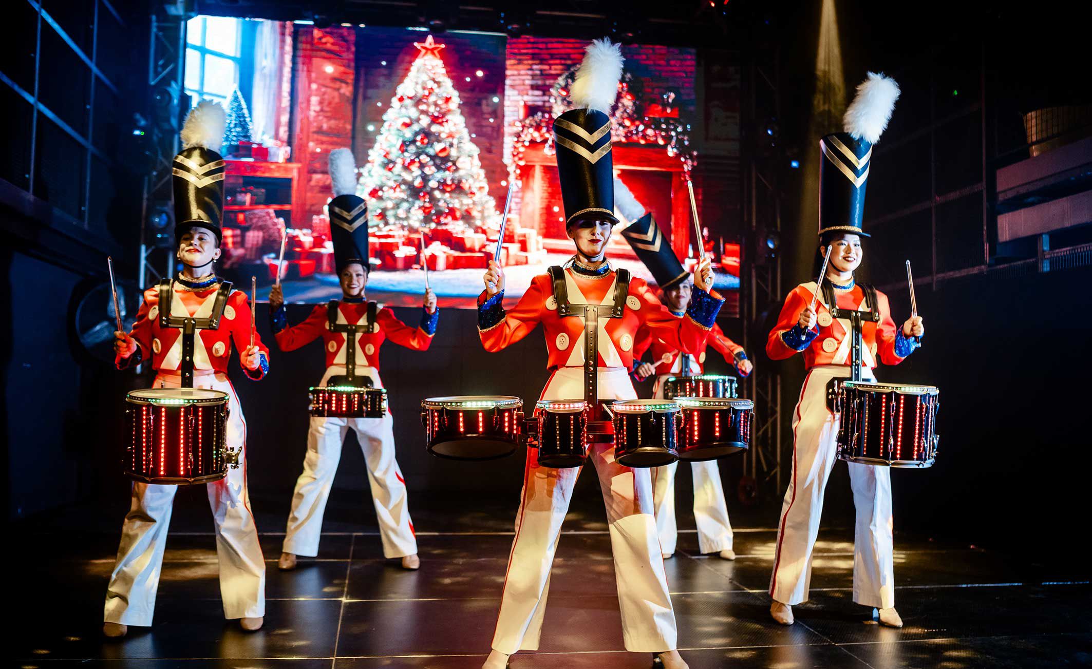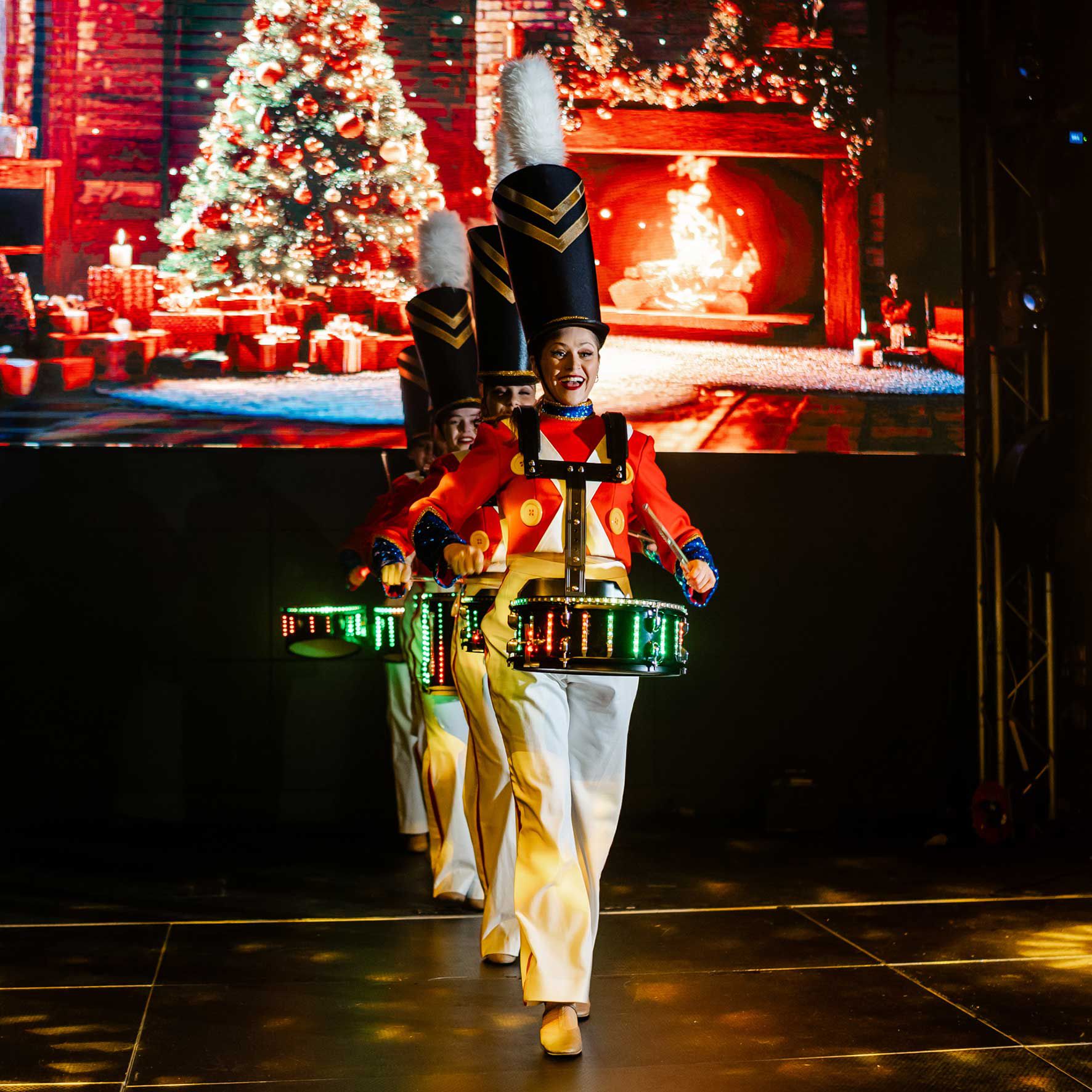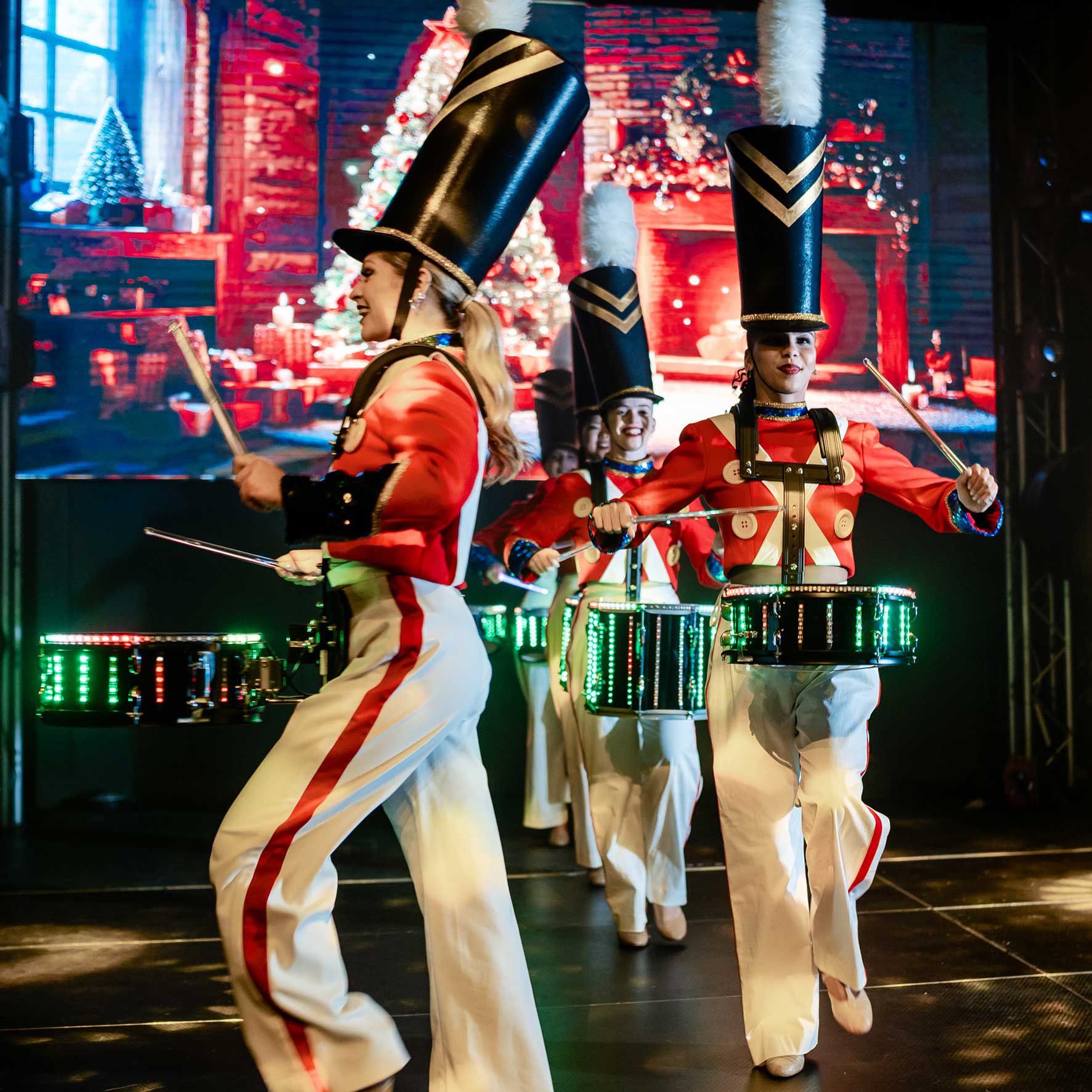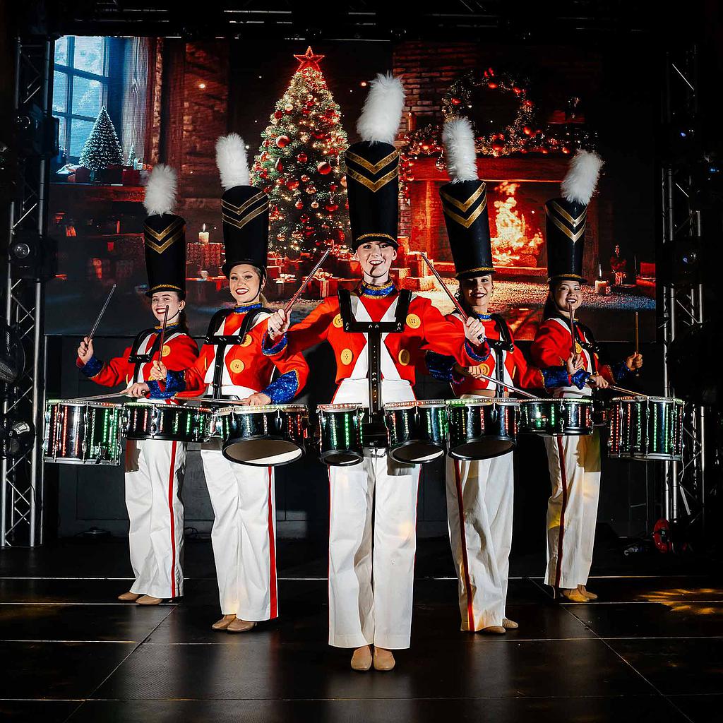 Indossando costumi da soldatini giocattolo di alta qualità, i nostri tamburini eseguiranno una coreografia, suonando a ritmo di musica.