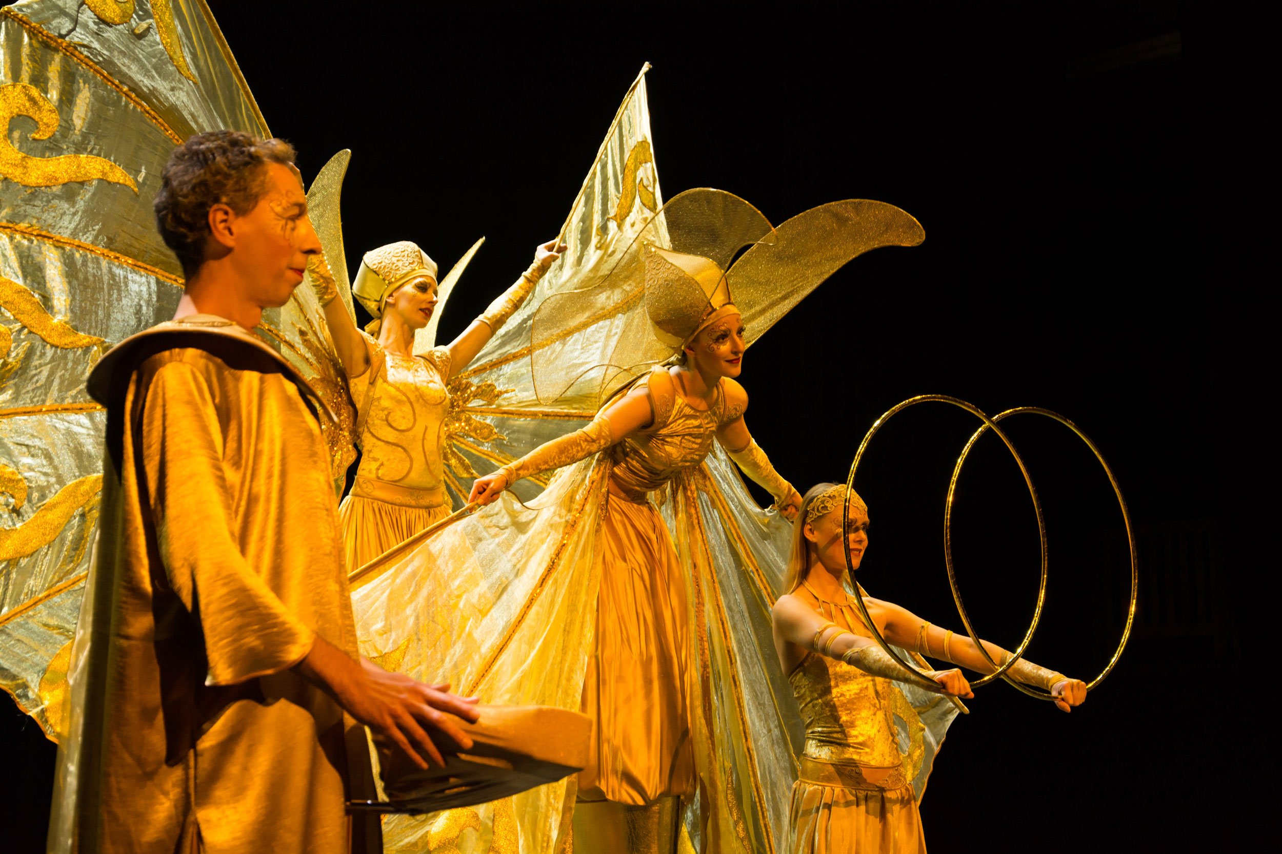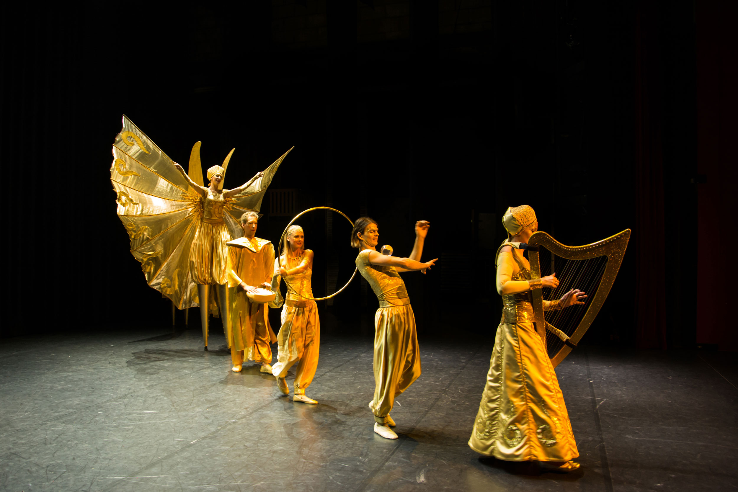 I loro splendidi costumi dorati conferiscono un'atmosfera esclusiva a qualsiasi evento e creano un'estetica elegante che sicuramente impressionerà gli ospiti. Evocando immagini di antiche civiltà, tutti i loro costumi sono stati progettati e realizzati su misura per creare questa performance specifica. Artisti di hula hoop, arpisti, ballerini di nastri, ballerini acrobatici e camminatori su trampoli si uniscono per creare questo incredibile spettacolo teatrale e sono disponibili anche come atti ambulanti autonomi.