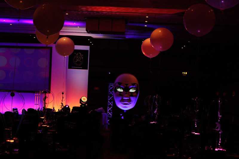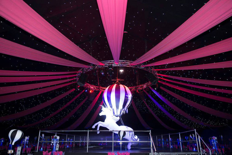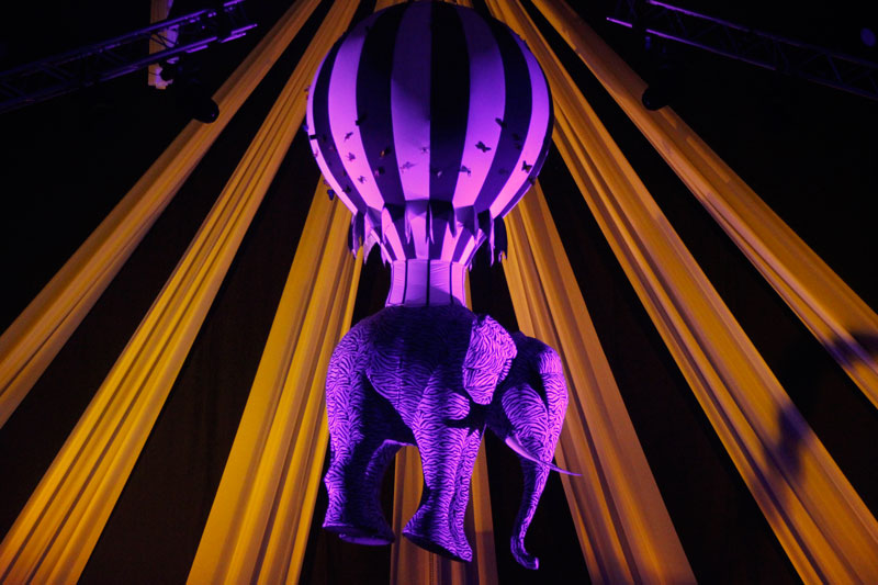 L'atmosfera è enfatizzata utilizzando una tonalità in bianco e nero con un tocco di colore. Centrotavola, pannelli luminosi, tendaggi, mobili e persino un elefante 3D sospeso da un pallone gigante di sei metri completano questa curiosa decorazione per eventi!