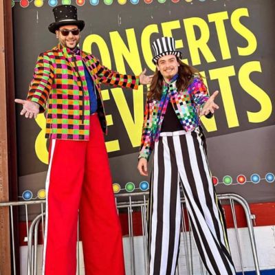 Formazione flessibile di artisti sui trampoli pronti per feste private o eventi su larga scala, offrendo pacchetti personalizzati per soddisfare le esigenze del tuo evento