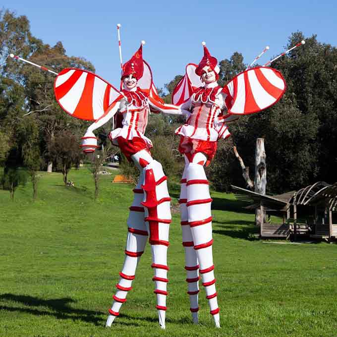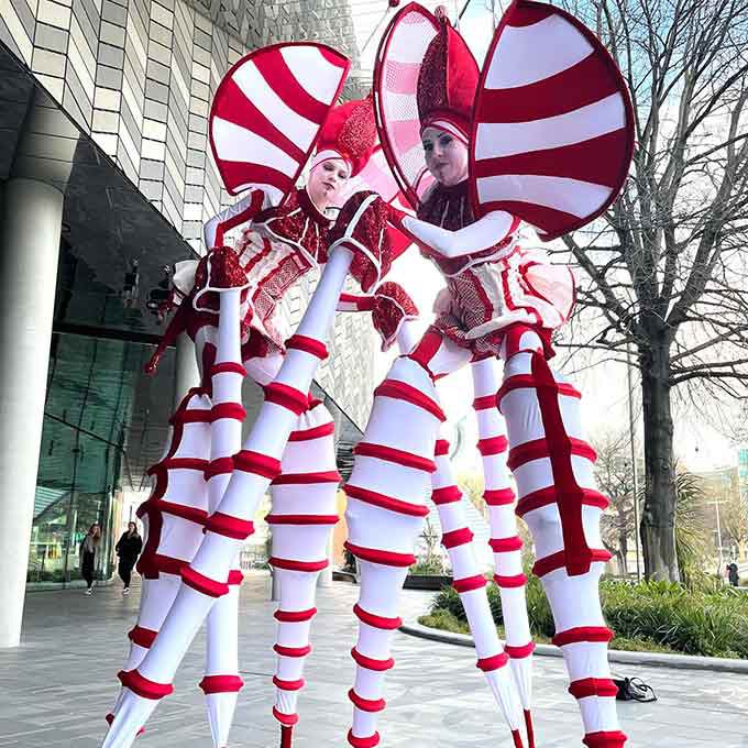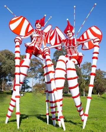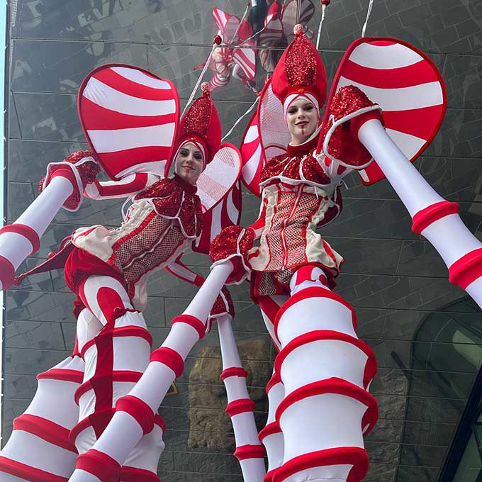 I nostri artisti su trampoli a forma di bastoncino di zucchero sono perfetti per diffondere la magia in questa stagione festiva durante eventi natalizi, festival, carnevali, giornate in famiglia e molto altro ancora.