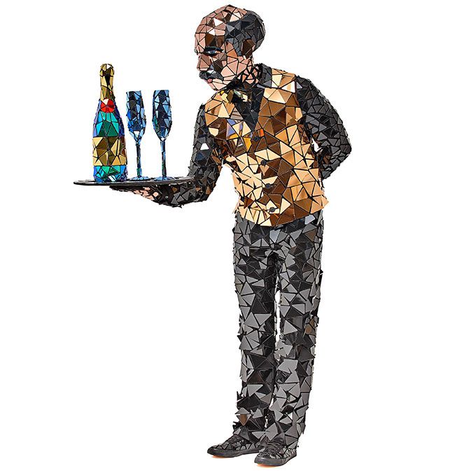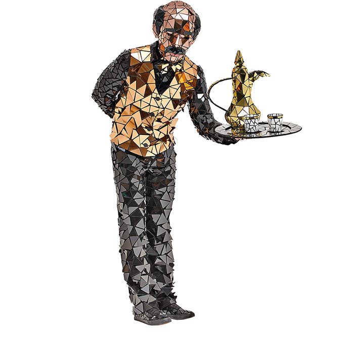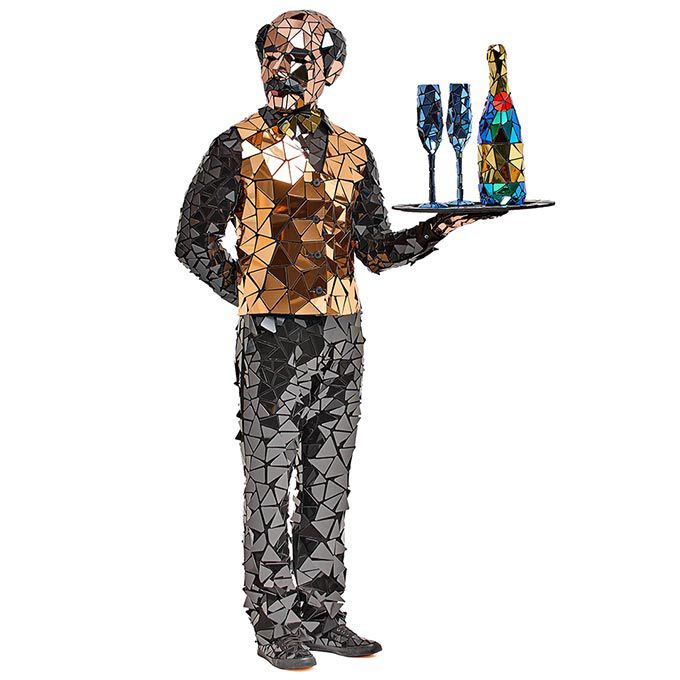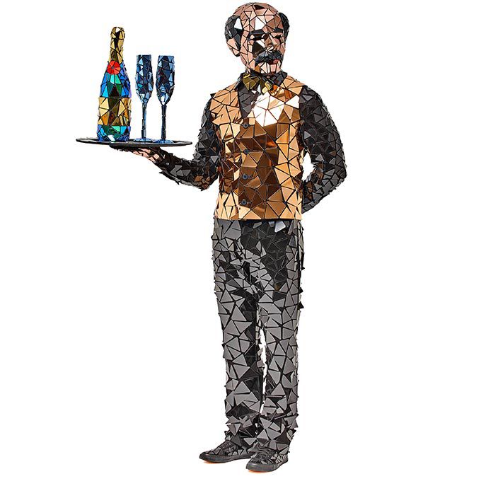Il nostro cameriere di specchia farà sicuramente colpo al tuo evento mentre interagisce con gli ospiti fingendo di versare caffè o champagne dai suoi accessori specchiati.