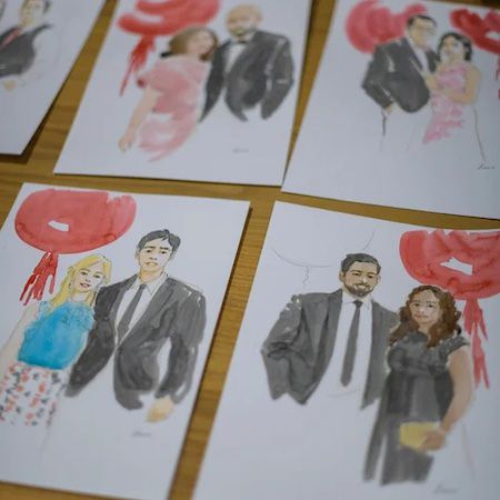 Le sue ritratti ad acquerello possono essere disegnati dal vivo mentre gli ospiti si mettono in posa o da foto di riferimento, permettendo loro di continuare a socializzare durante l'evento.