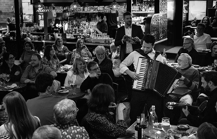 He can also team up with our superb Gypsy Jazz & Swing Band to create the ultimate in foot-tapping, double-bass thumping party music. Consider booking our accordionist as a background café music act to set the theme of your event, then get the party in full swing with the gypsy jazz band at the reception.