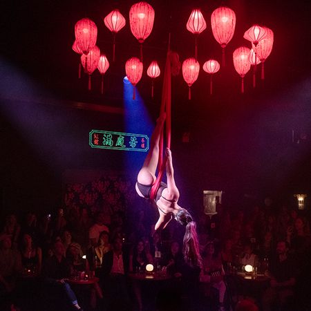 A professional aerial hammock performer with experience captivating audiences at top NYC venues like The Slipper Room and Red Pavilion