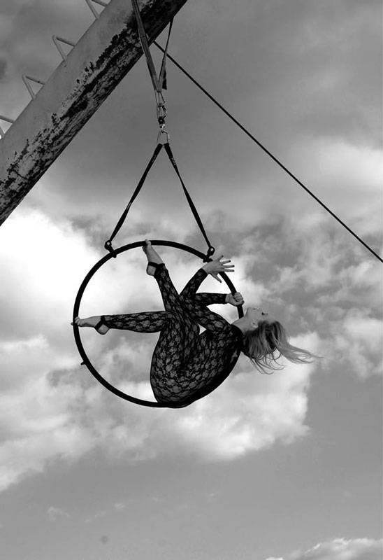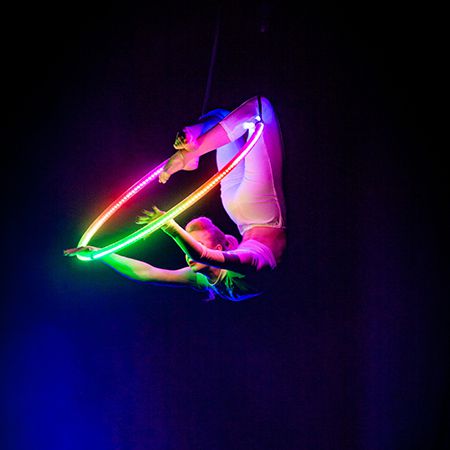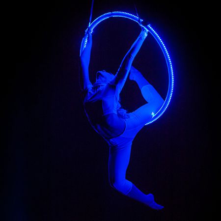 Our aerial hoop dancer performs her aerial routines with exceptional delicacy, grace, and style. Incredibly flexible, she can execute complex moves and formations high in the air or just a few feet off the ground.