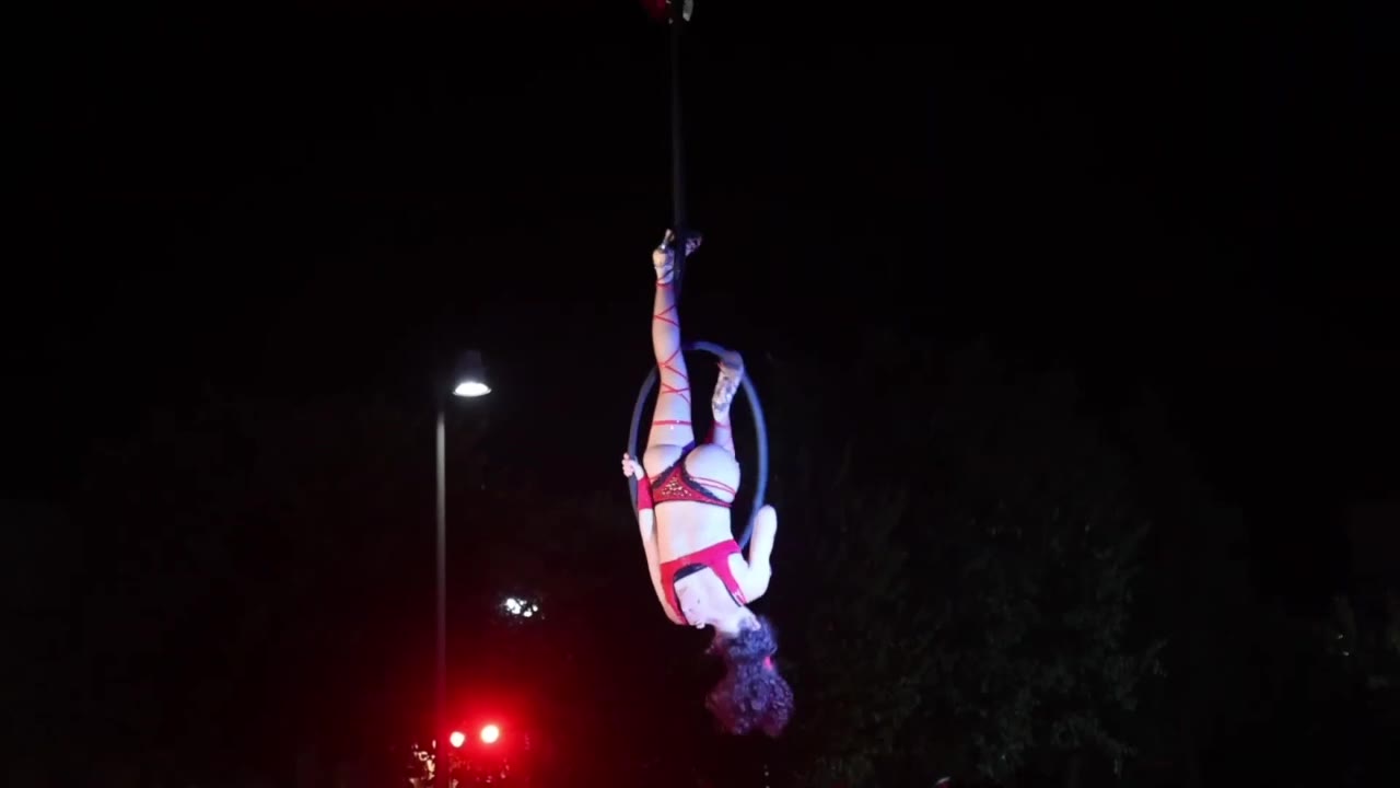 Captivates audiences with stunning aerial hoop and heels performances, combining strength, grace, and daring acrobatics