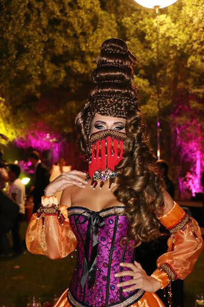 A distinctive addition to your Arabian Nights party decor, this glamorous living human table will capture everyone’s attention. Featuring a luxurious corset dress adorned with straps and stone gems, our hostess’s look is enhanced with gorgeous accessories like veils and lush jewelry.